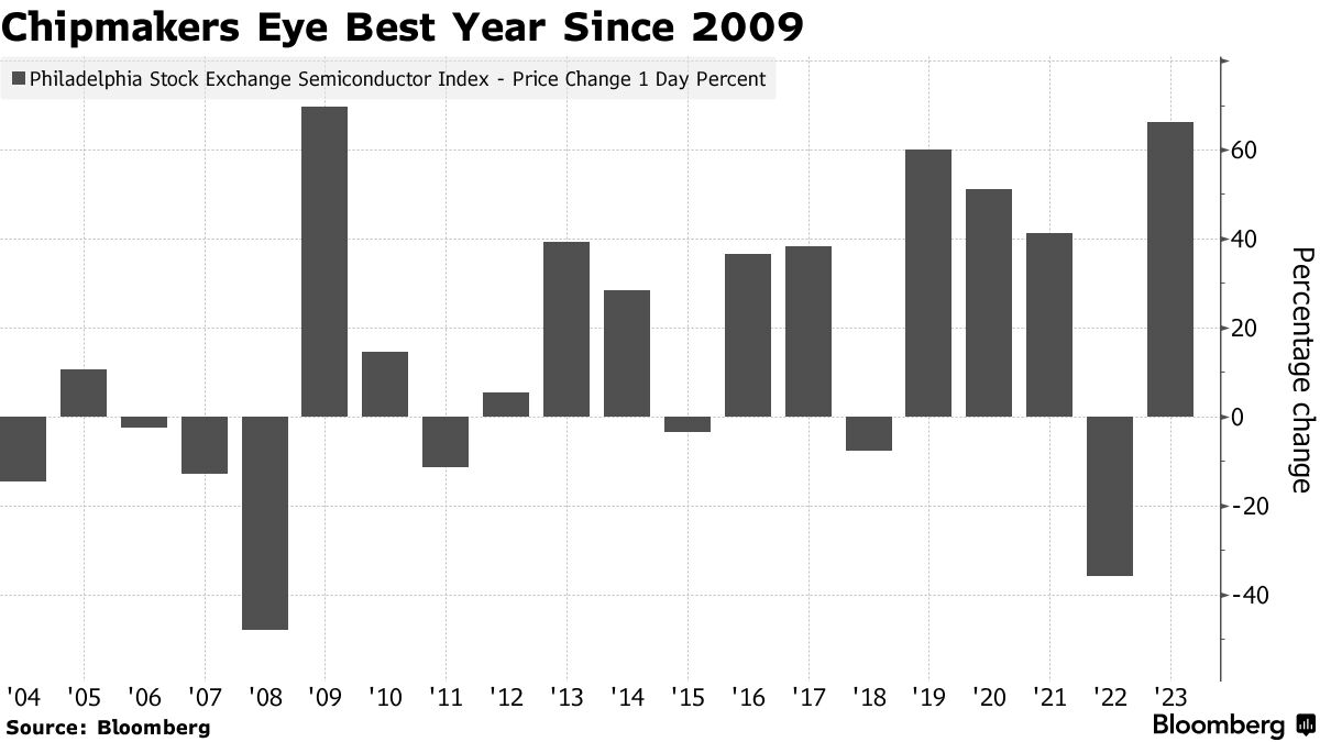 费城半导体交易所指数今年上涨了66%,2023年有望成为自2009年以来涨幅最大的一年,当时在金融危机市场触底后上涨了70%。该指数在年末最后一个交易日周五基本持平,但接近创纪录水平。