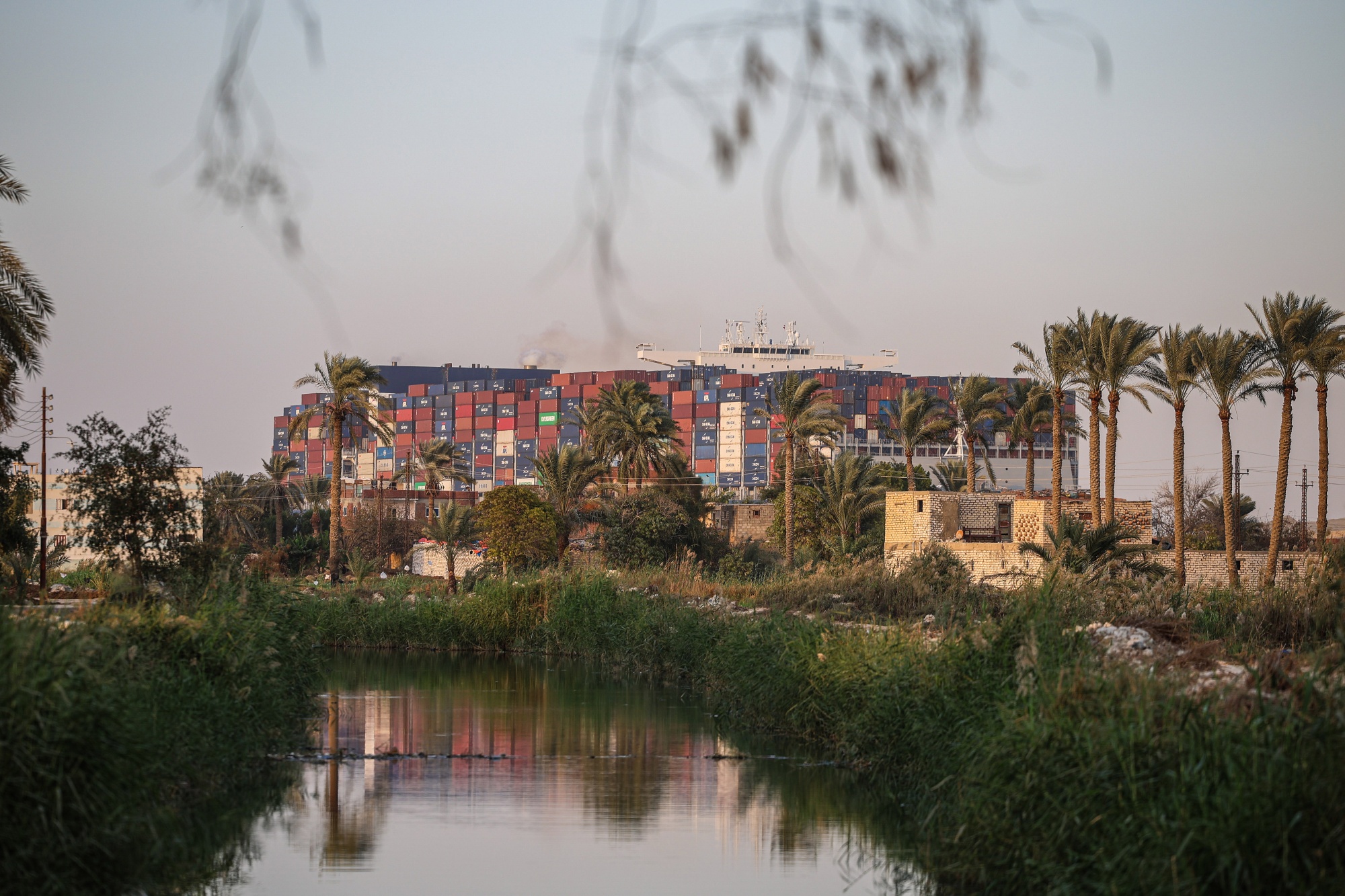 埃及苏伊士运河的一艘集装箱船。