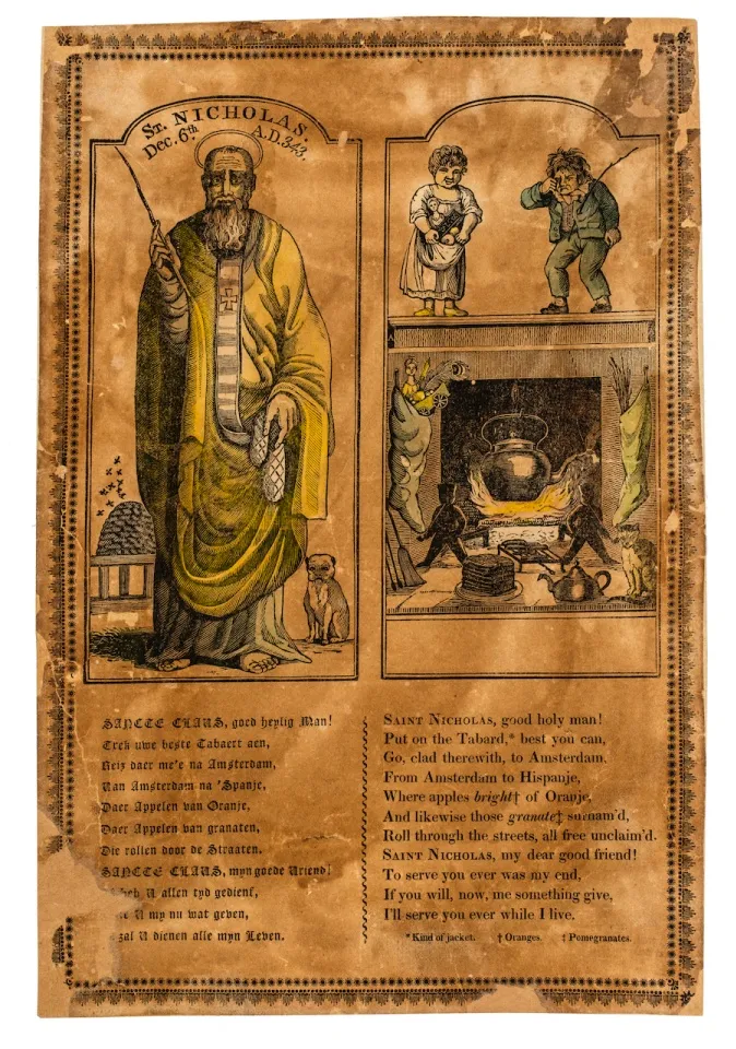 那么,为什么这个传统没有出现在书面记录中呢?一个答案是它现在确实出现了。几十年前,贾尼·维内马,格赫林在新荷兰研究中心的长期副手,发现了1675年在阿尔巴尼附近的范·伦斯塞勒庄园的记录中关于“圣尼古拉斯食品”——烘焙食品的购买记录。还有一个18世纪的荷兰圣尼古拉斯饼干模具,描绘了圣人救助腌制儿童的场景,收藏于克罗顿河上的范·科特兰庄园,烹饪历史学家彼得·G·罗斯在她的书中美味的十二月中讲述了她研究纽约荷兰家庭的几个世纪前的手写食谱,这些食谱包含了圣尼古拉斯特色食品的配方,如硬和软姜饼以及香料蜂蜜蛋糕。