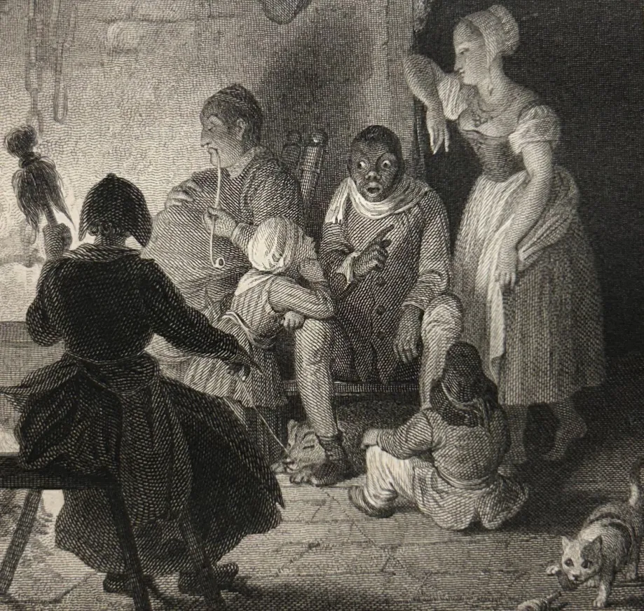 在欧文的密友查尔斯·罗伯特·莱斯利为1824年英国版的*《历史》*创作的场景插图中,家里的小女孩亲切地把肘部靠在讲故事者的膝盖上。小男孩坐在他的脚边,少女专心地看着,父母则忙于其他事务。