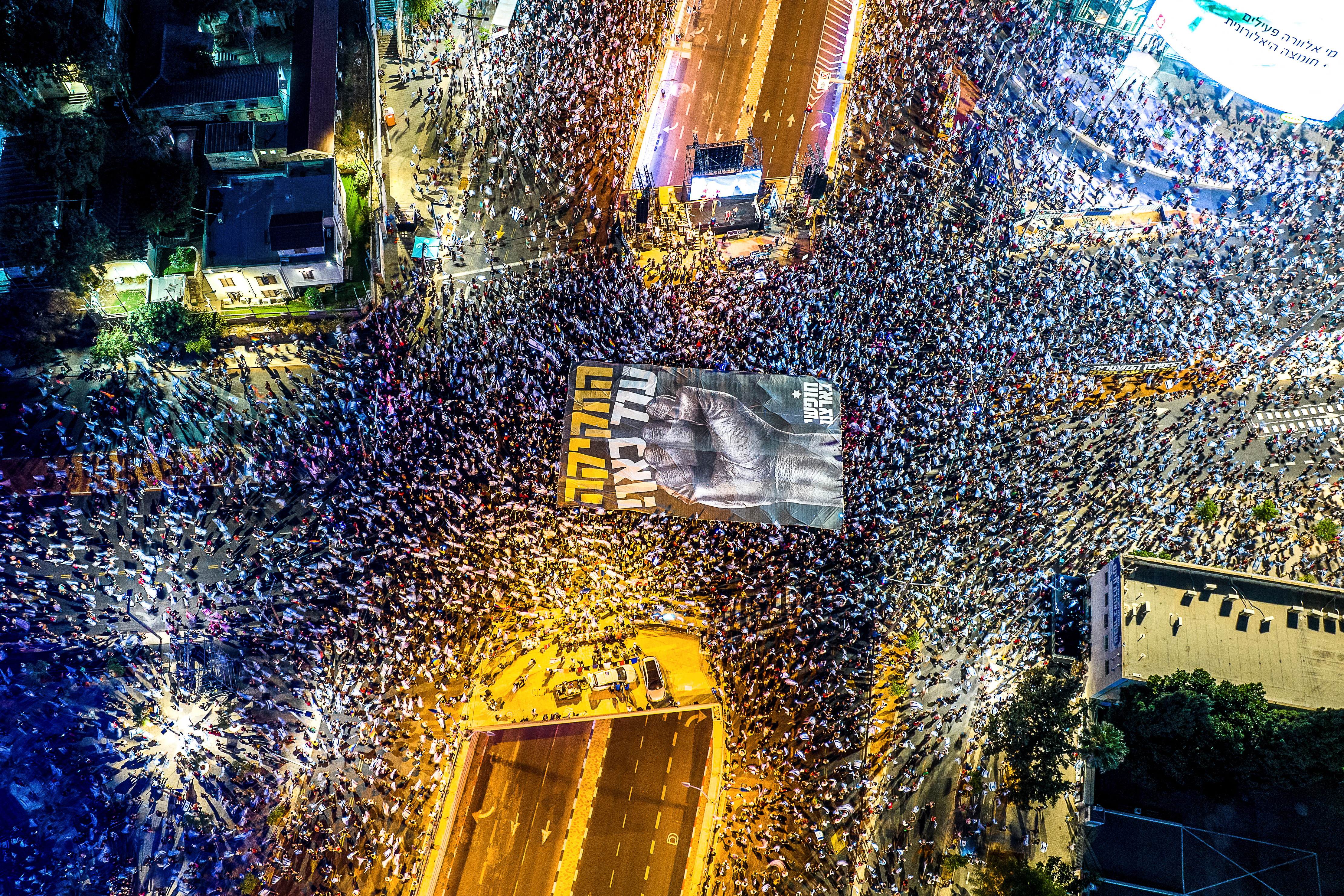一张航拍照片显示抗议者举着横幅参加了针对以色列总理本雅明·内塔尼亚胡及其民族主义联盟政府司法改革的示威活动,地点在以色列特拉维夫,2023年6月17日。横幅上写着:“立法还在这里”。 路透社/Oren… 阅读更多