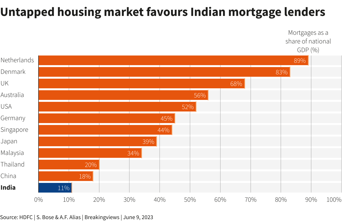 然而,未偿抵押贷款占该国国内生产总值的比例仅为11%,HDFC估计,而中国为18%,美国为52%。这对规模更大、更精简的HDFC银行来说是一个巨大的机会-直到现在,它将大部分自己发放的抵押贷款卖给了母公司。值得注意的是,由政府控制的印度国家银行(SBI.NS)仍将是该国最大的放贷机构。然而,HDFC银行抵押贷款在其组合中的份额将接近30%,而SBI为20%。这将使印度购房者成为该银行的主要客户。考虑到HDFC的借款人中不到三分之一也在交易对方的实体拥有账户,这为向他们跨销信用卡和车辆贷款等产品提供了充分的空间。