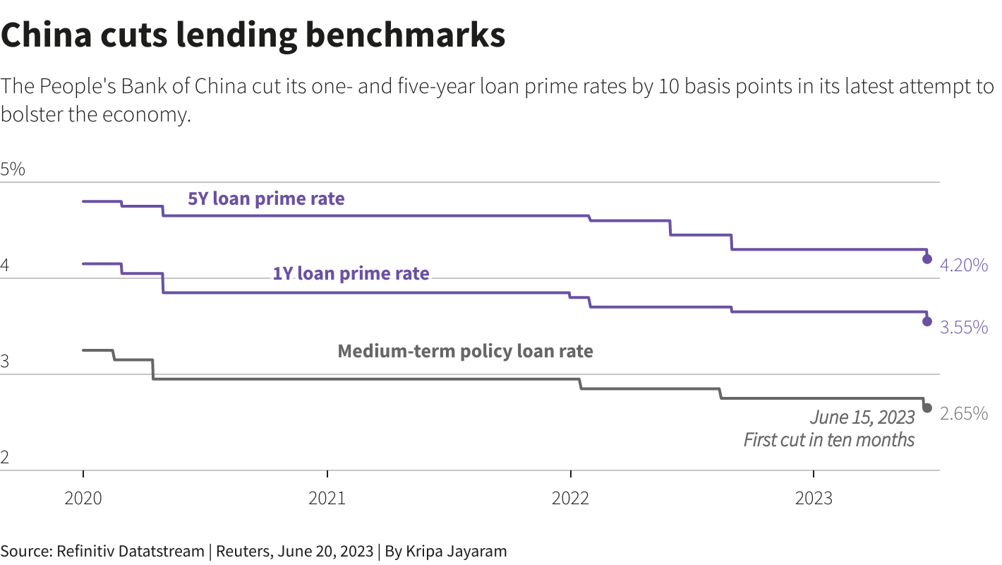 上海/新加坡,6月20日(路透社)- 中国周二下调了其关键的贷款基准利率,这是10个月来的首次下调,因当局试图支撑增长放缓的经济复苏,尽管对房地产市场的担忧意味着宽松程度不及预期。