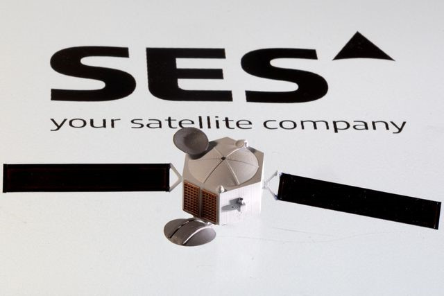 卫星模型放置在SES标志上,这是2022年4月4日拍摄的图片插图。路透社/Dado Ruvic/插图/文件照片