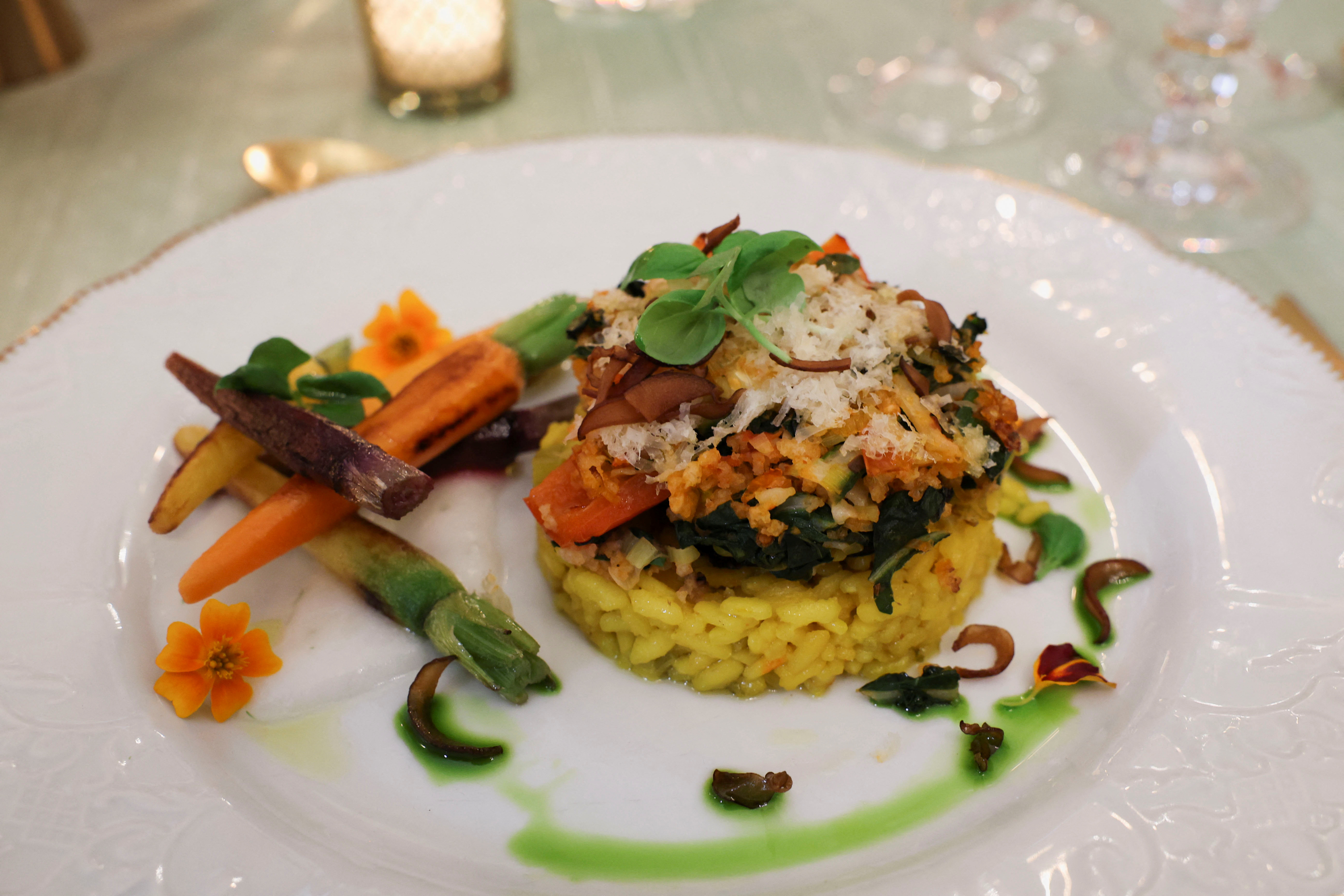 主菜将包括牛肝菌和奶油藏红花意大利烩饭,甜点将以玫瑰和豆蔻浸泡的草莓蛋糕为特色。