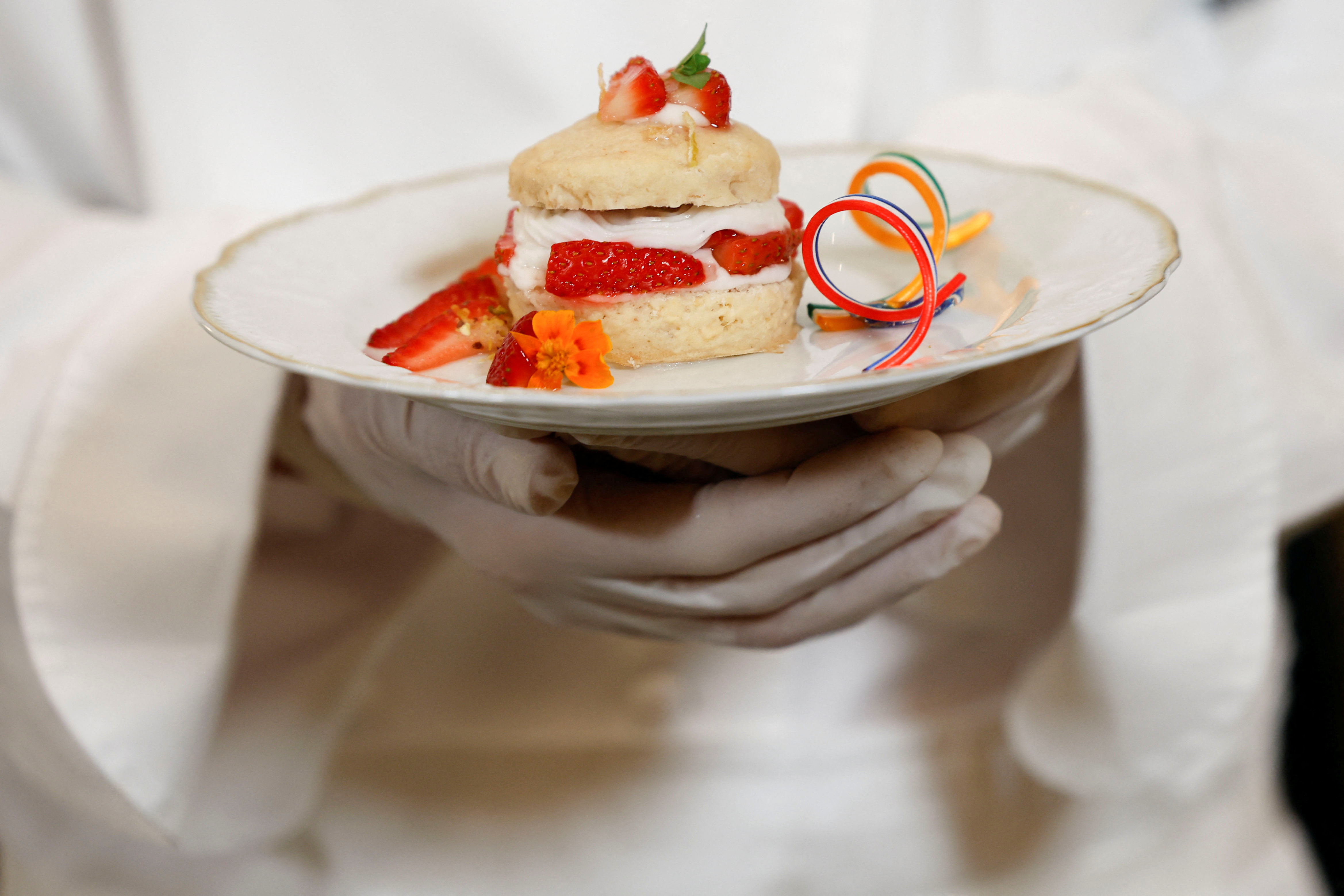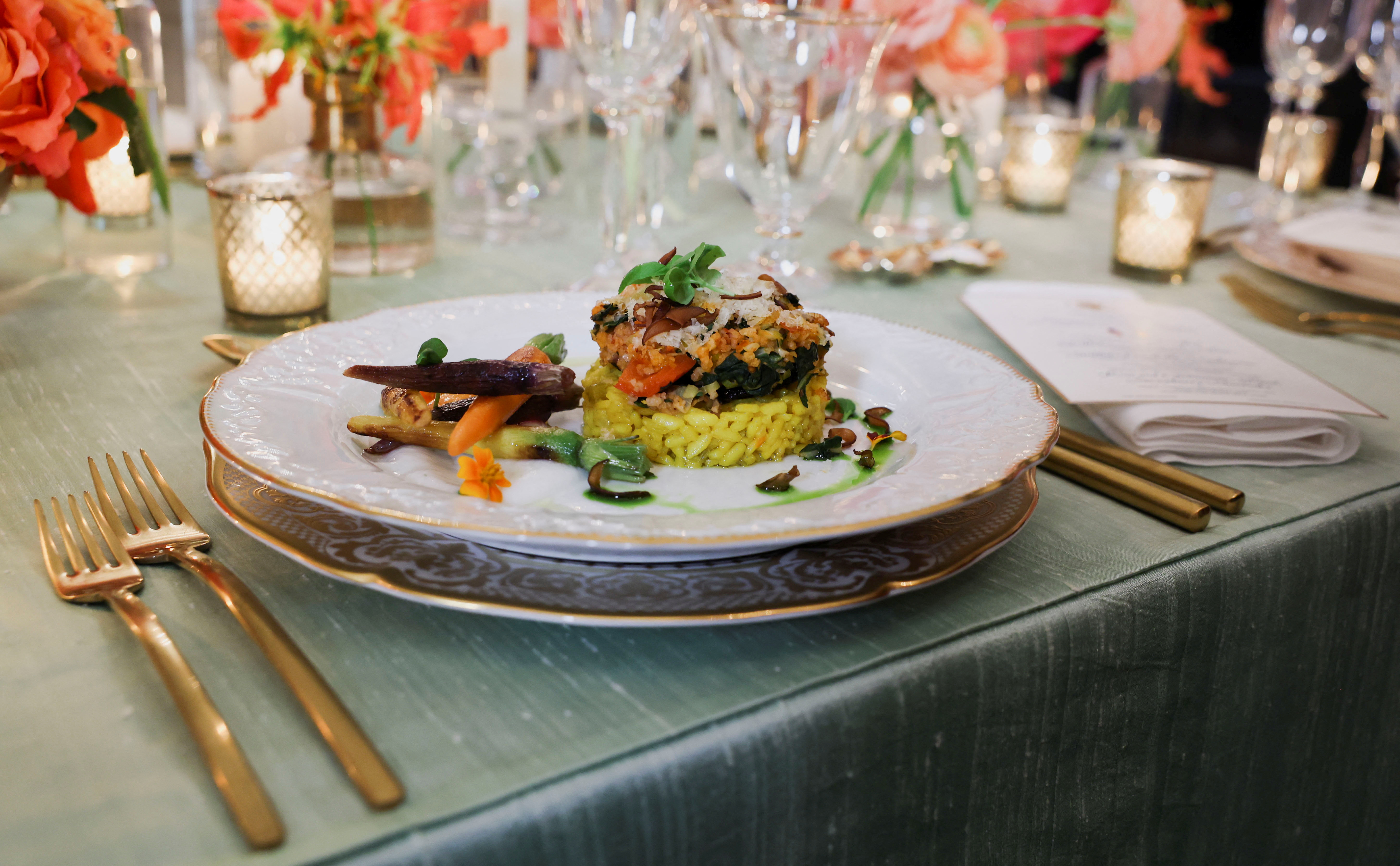 美国第一夫人吉尔·拜登在华盛顿白宫国宴之前举办媒体预览,为印度总理纳伦德拉·莫迪对美国的正式访问做准备,照片中展示了一道菜。2023年6月21日,美国华盛顿白宫国宴厅。路透社/Evelyn Hockstein