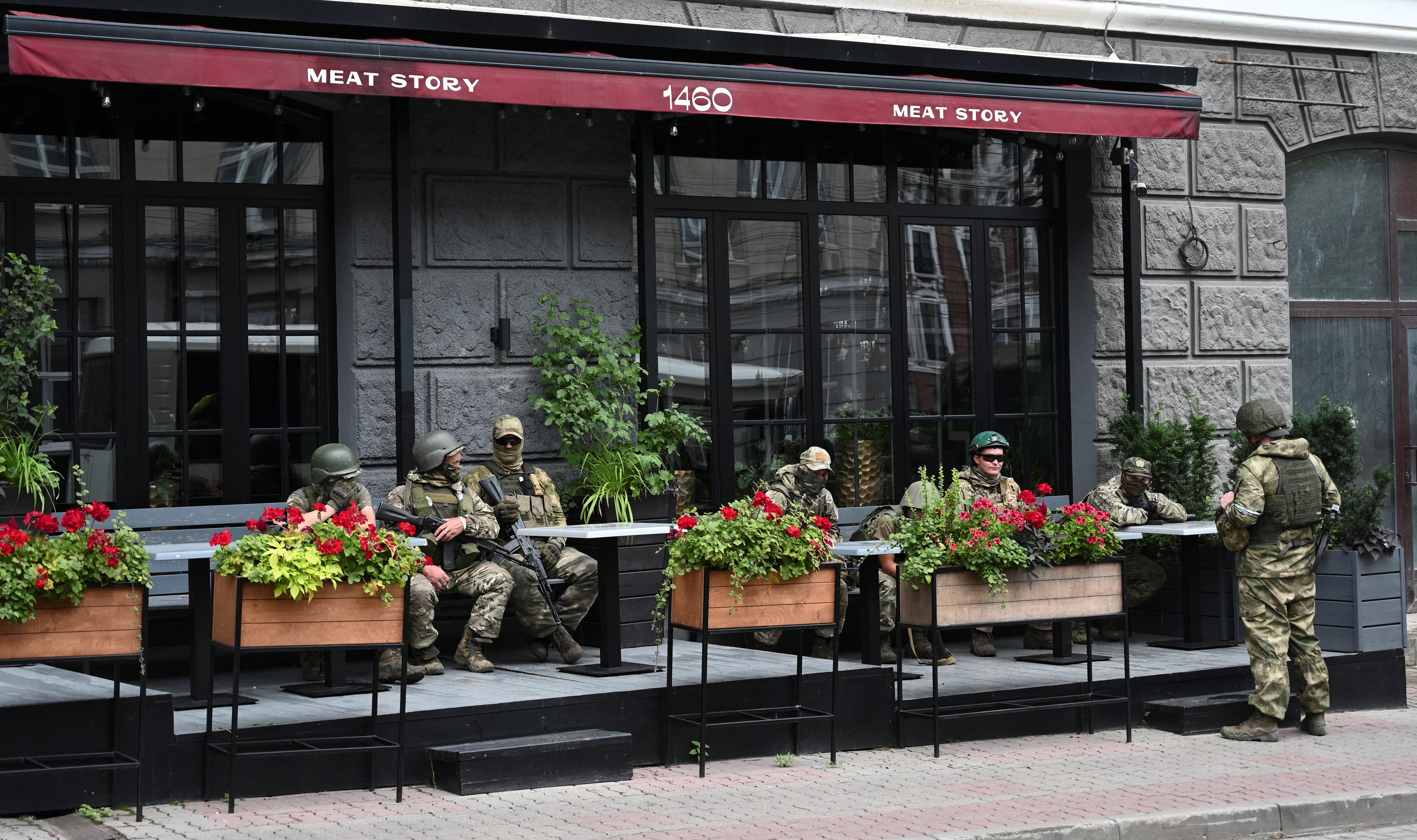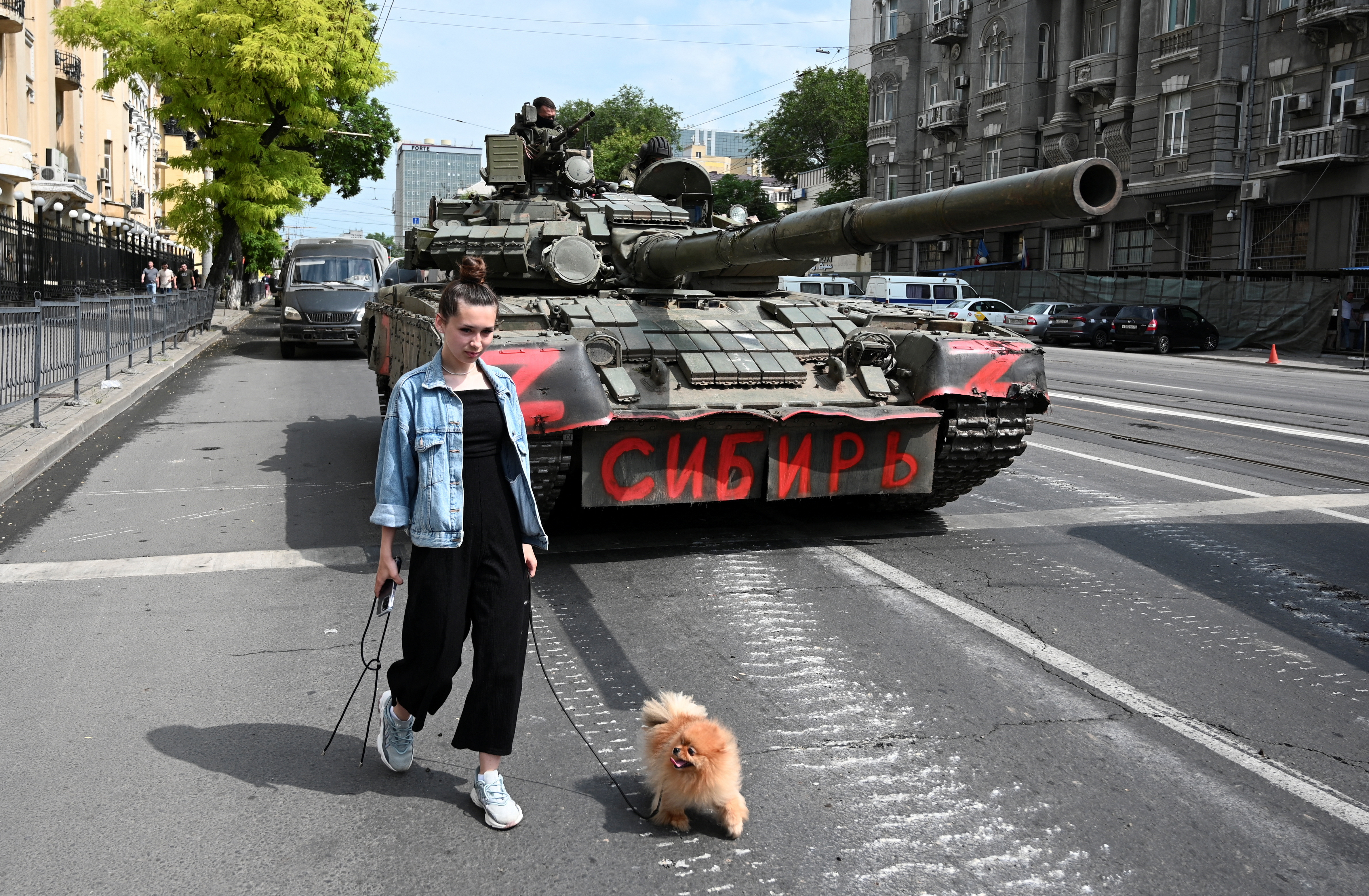该市的居民在街上平静地走动,用手机拍摄瓦格纳战士在装甲车和战斗坦克中占据阵地的情景。