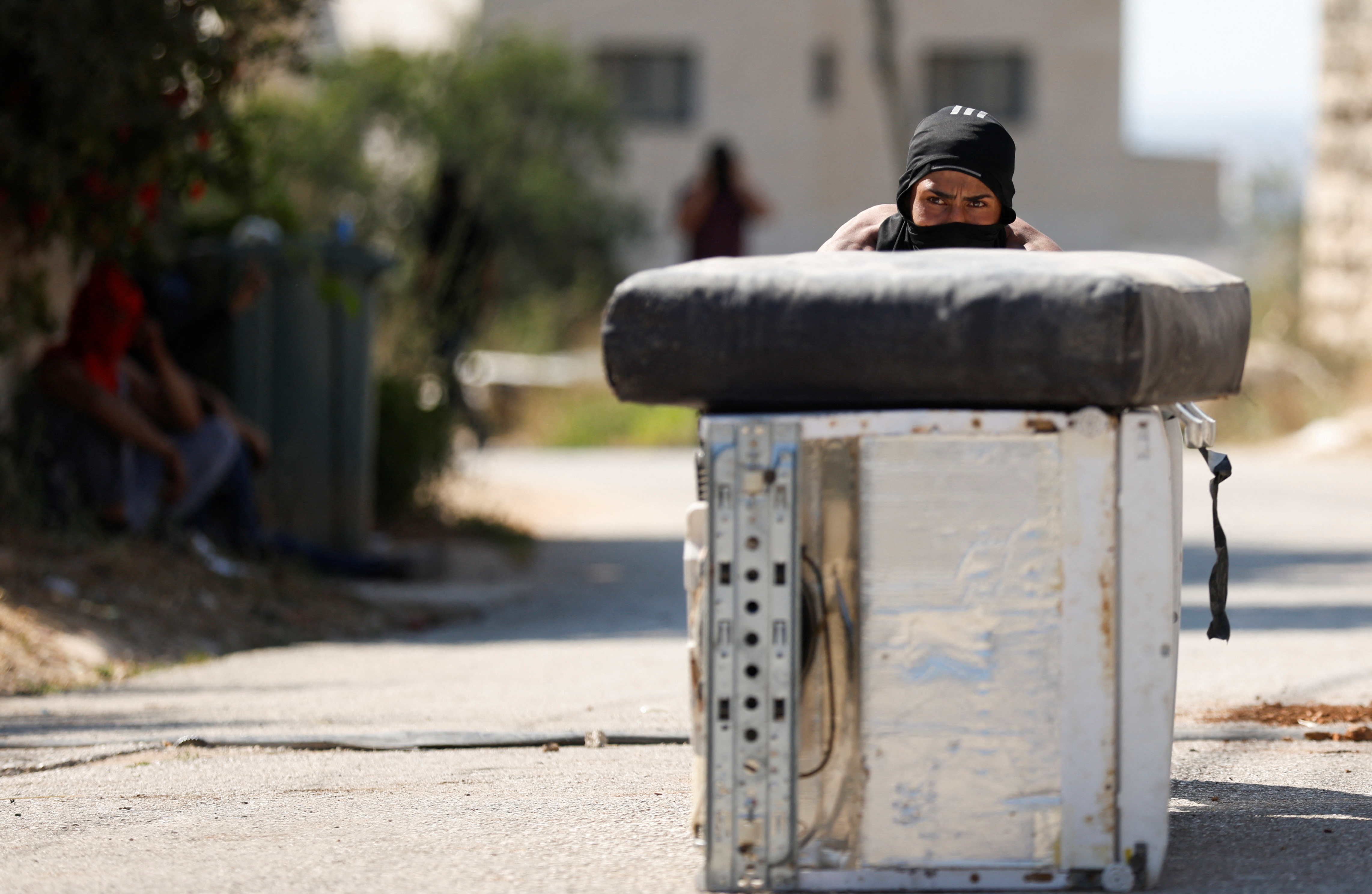 一名巴勒斯坦人在以色列占领的约旦河西岸拉姆安拉附近的乌姆萨法村遭到以色列定居者袭击后,与以色列军队发生冲突,2023年6月24日。路透社/莫哈迈德·托罗克曼摄