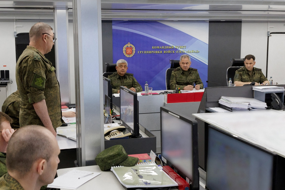 俄罗斯国防部长谢尔盖·绍伊古在这张于2023年6月26日发布的图片中参观了参与俄罗斯-乌克兰冲突的俄罗斯部队的高级指挥所,地点不详。俄罗斯国防部/路透社提供
