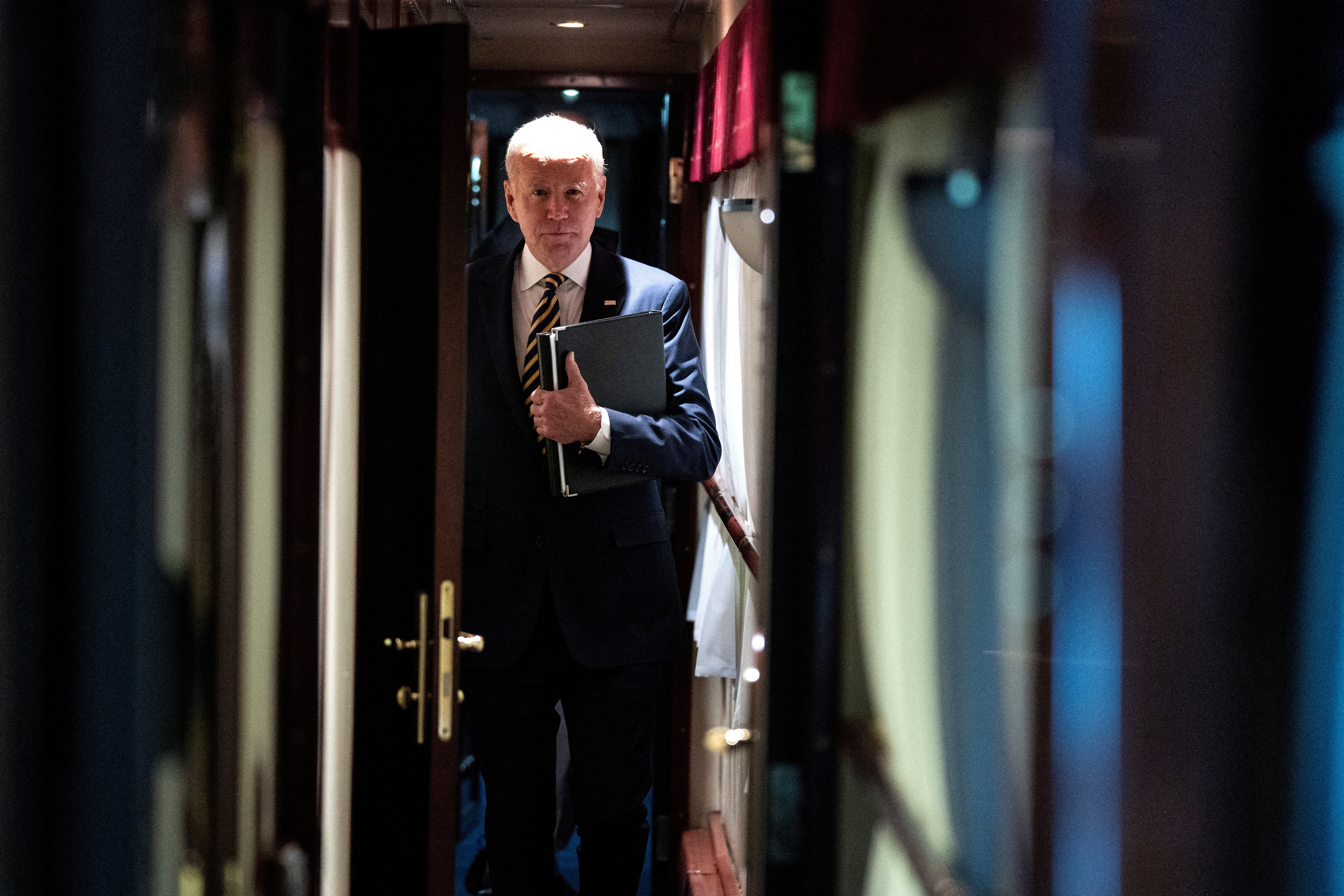 乔·拜登总统在与乌克兰总统沃洛迪米尔·泽连斯基进行突然访问后,步行进入火车上的小屋,2023年2月20日星期一,基辅。拜登乘火车从波兰到基辅,历时近10小时。埃文·沃奇/路透社/文件照片