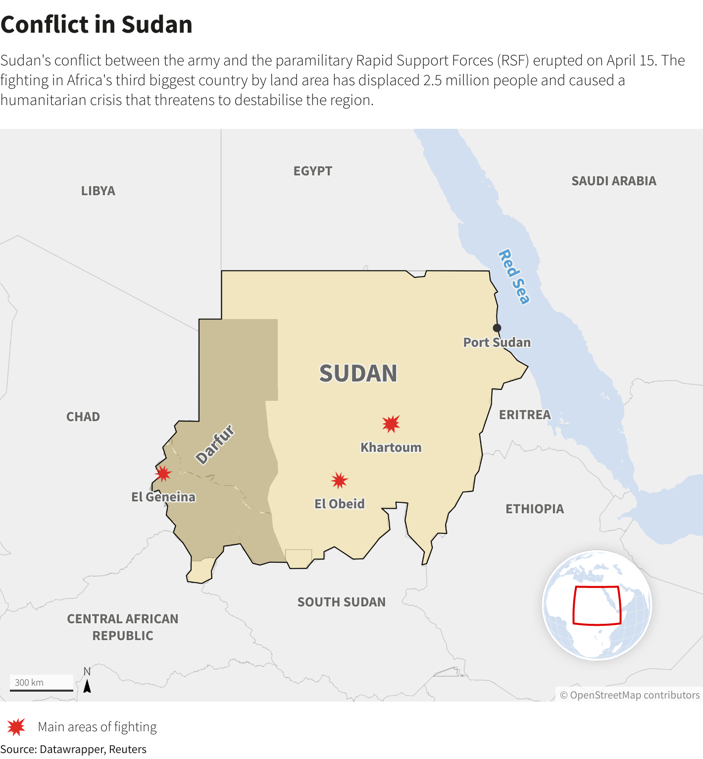 军队和准军事力量在非洲第三大国家苏丹的喀土穆、达尔富尔和其他地方交战已有10周时间,导致250万人流离失所,造成人道主义危机,并威胁着该地区的稳定。任何一方的增援都可能加剧冲突。作战