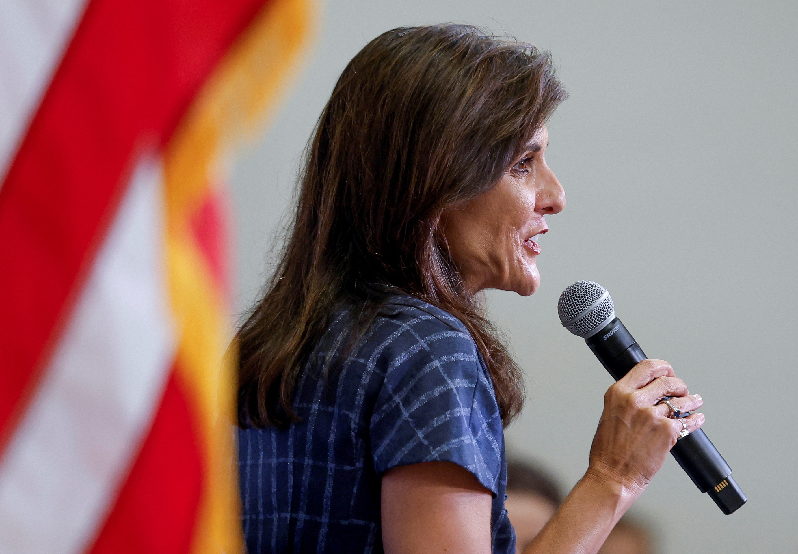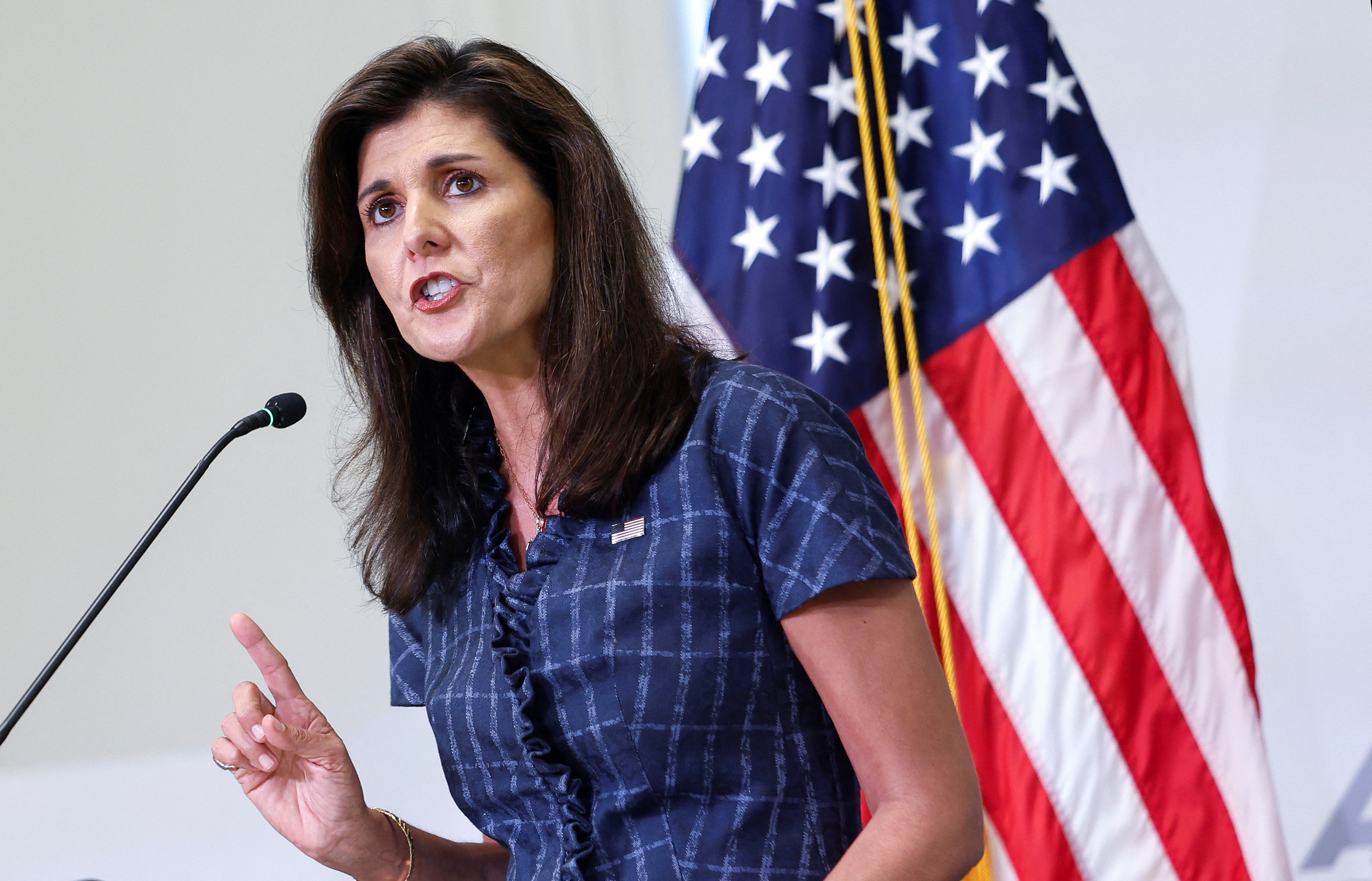 美国共和党总统候选人尼基·黑利在2023年6月27日在美国企业研究所举行的论坛上发表了关于中国的外交政策讲话。路透社/伊夫林·霍克斯坦摄