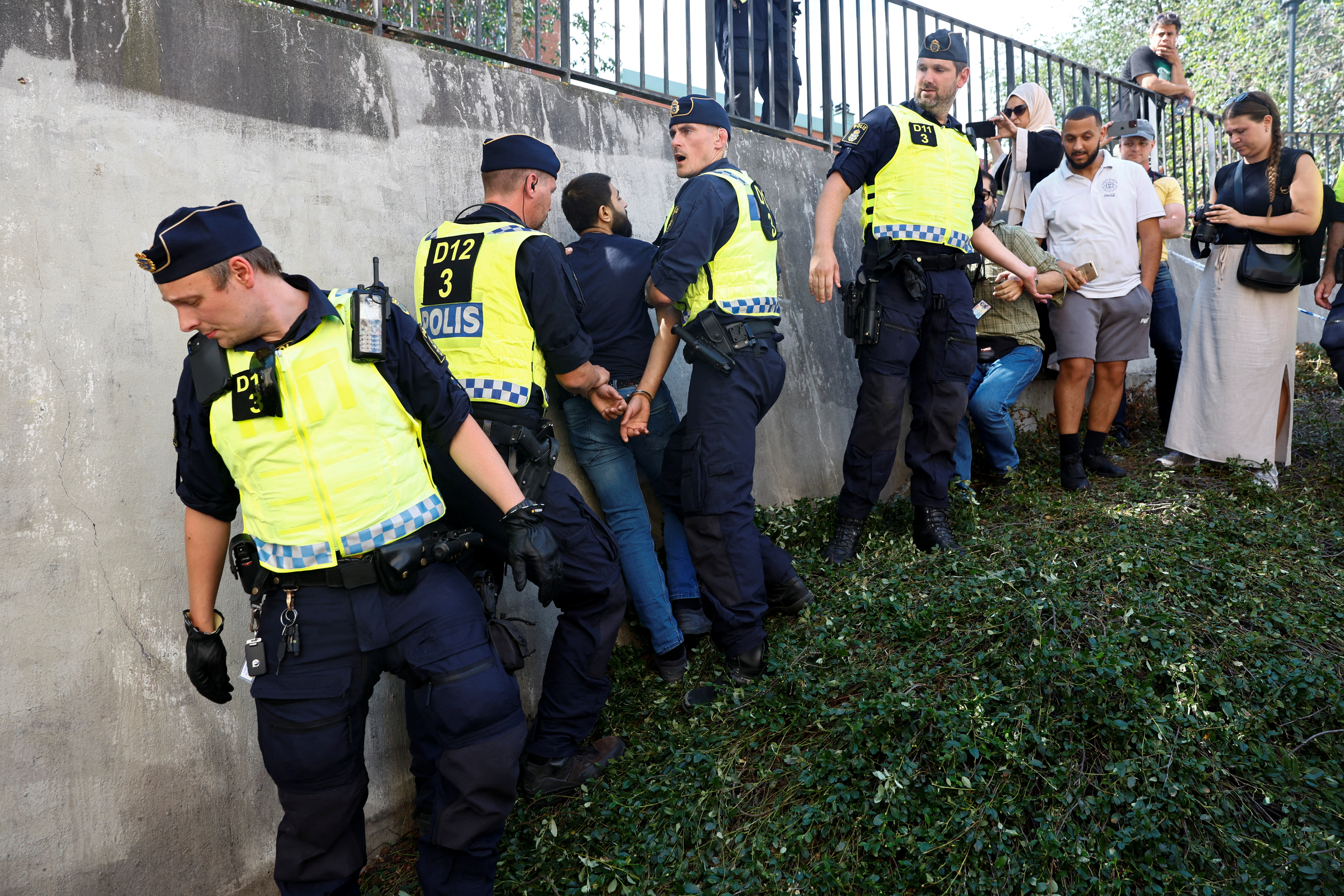 警察在人们烧毁古兰经(未出现在图片中)后干预示威者的反应,地点为2023年6月28日瑞典斯德哥尔摩中央清真寺外。TT新闻社/Stefan Jerrevang/路透社/通过 REUTERS