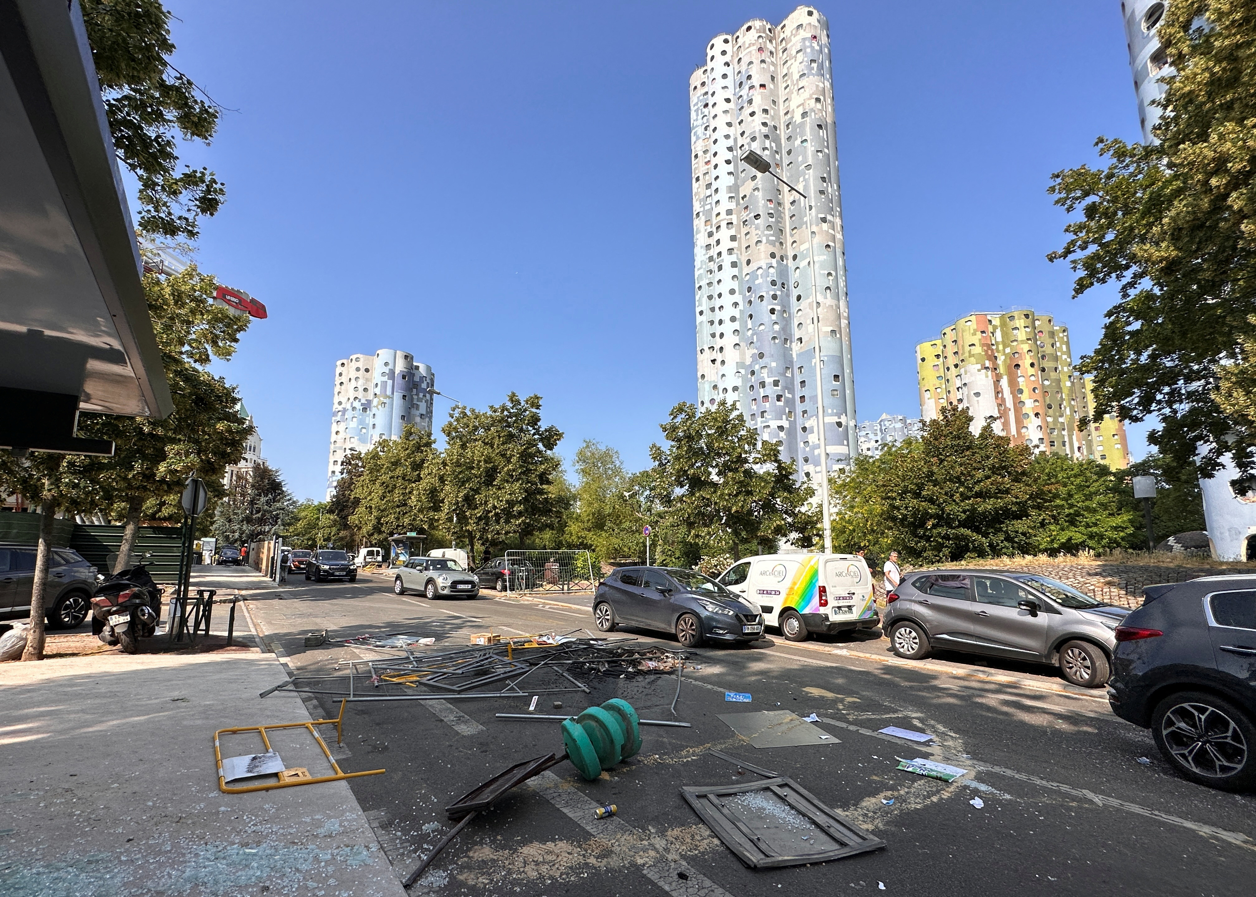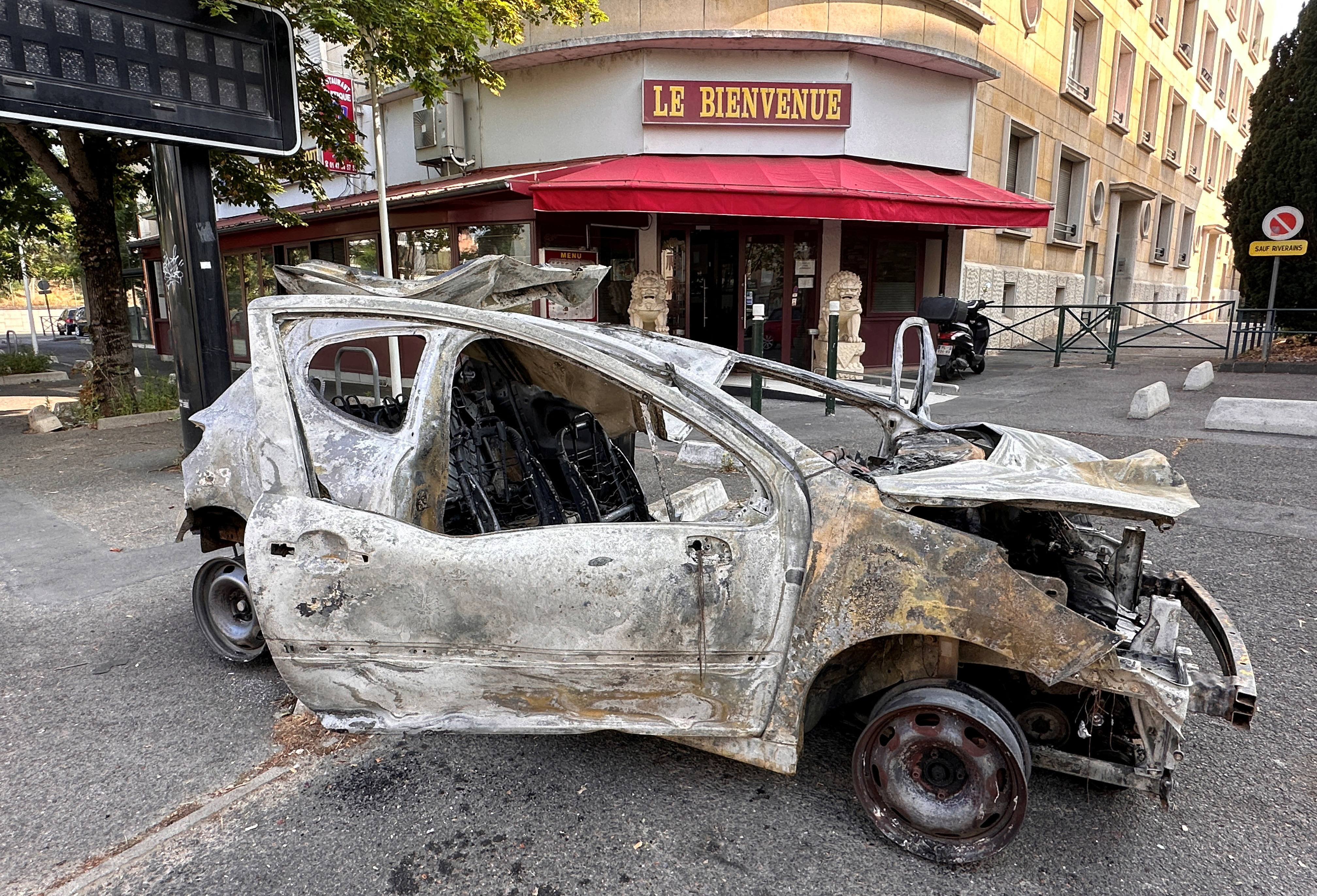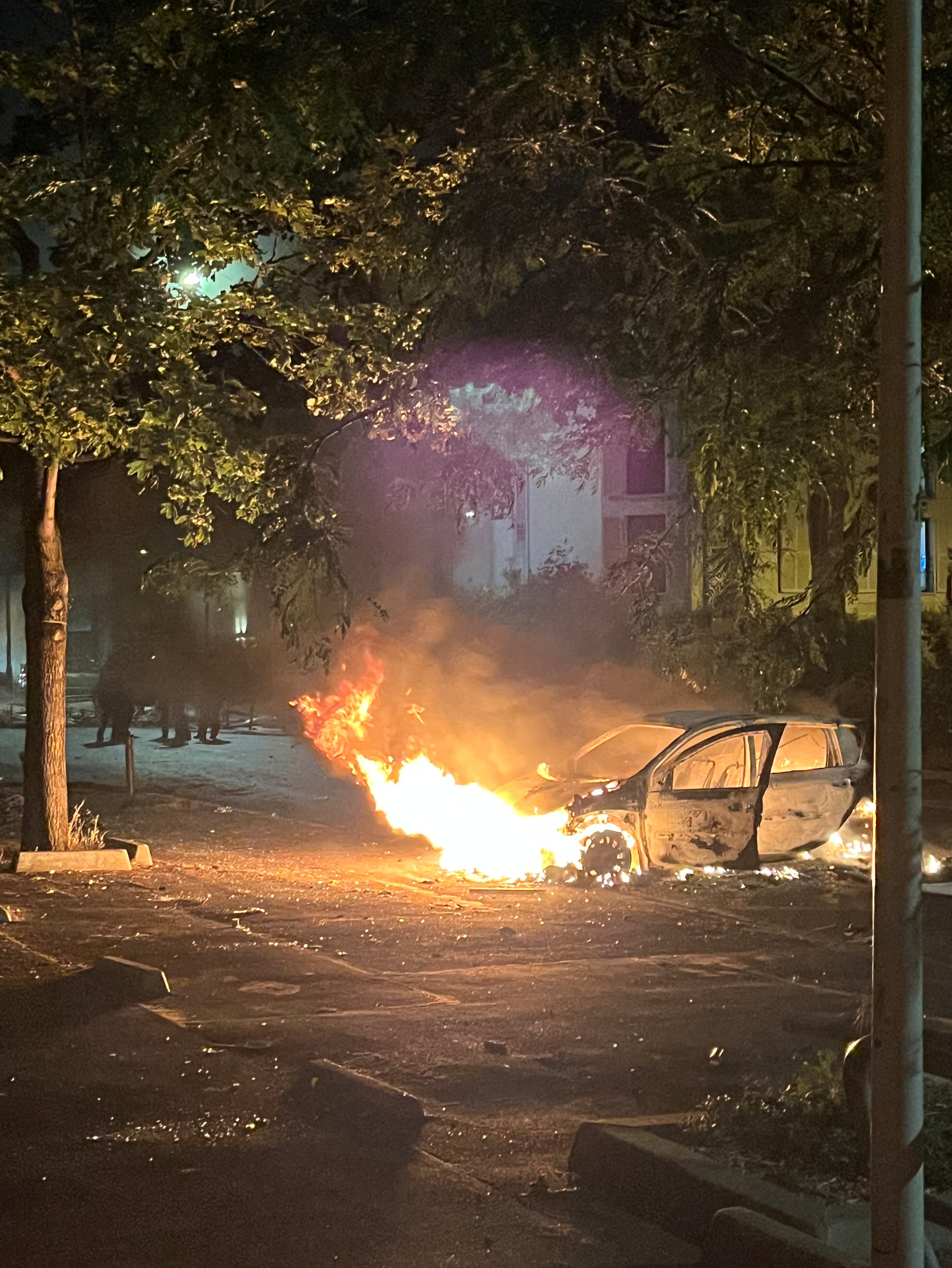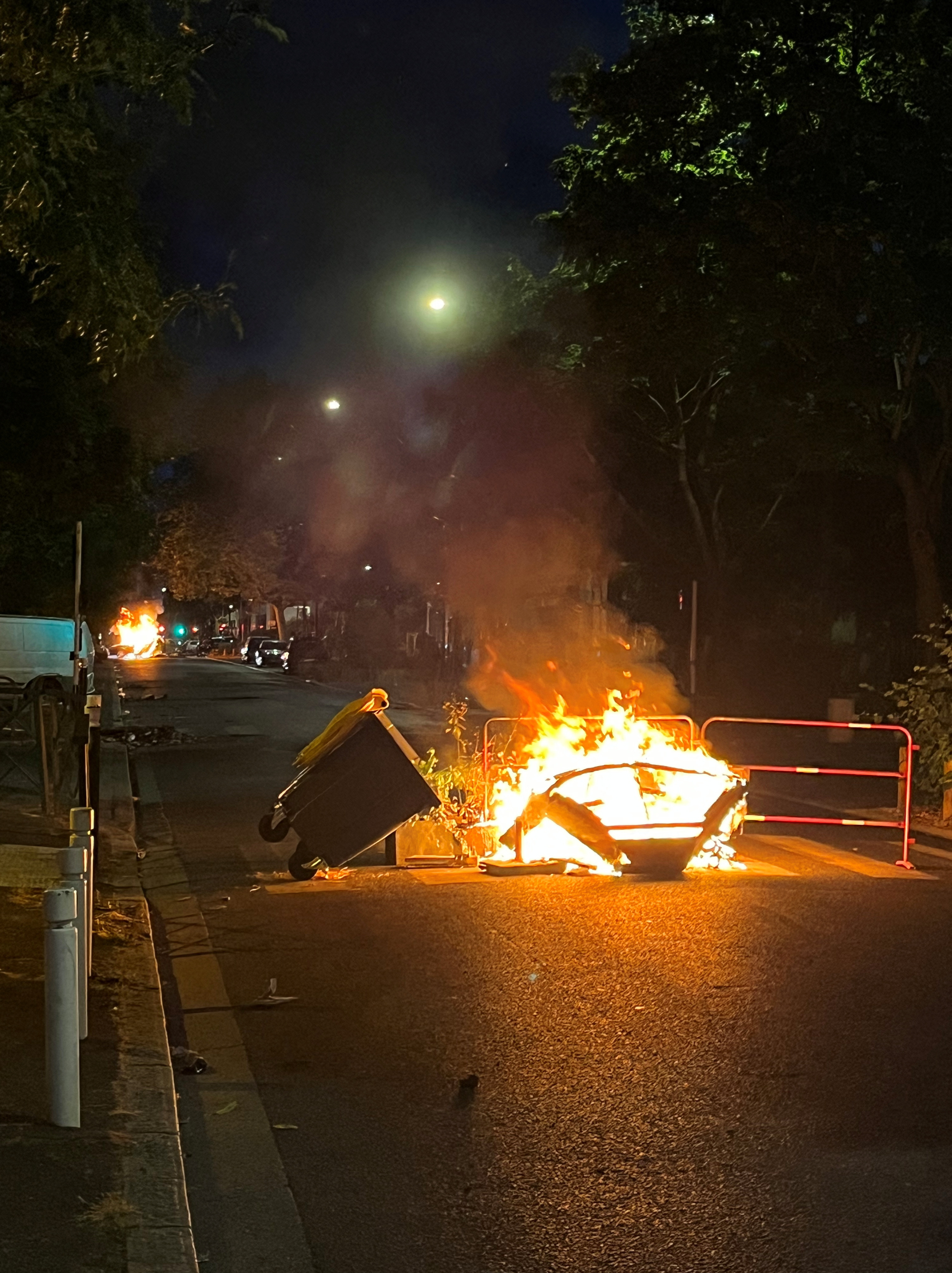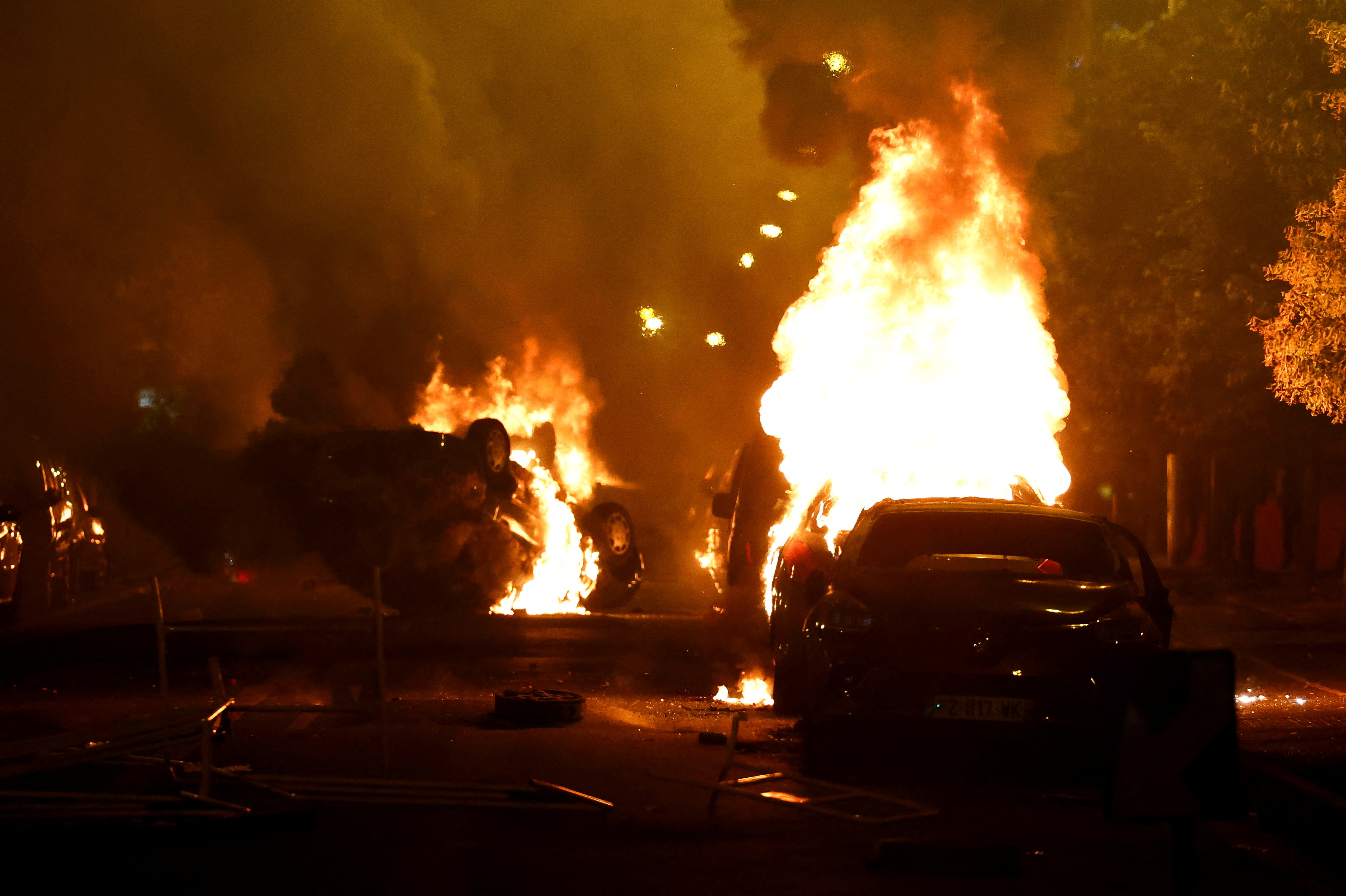 午夜前不久,南特尔的巴勃罗·毕加索大道上,一串翻倒的车辆在燃烧,烟花在警察阵线上嘶嘶作响。