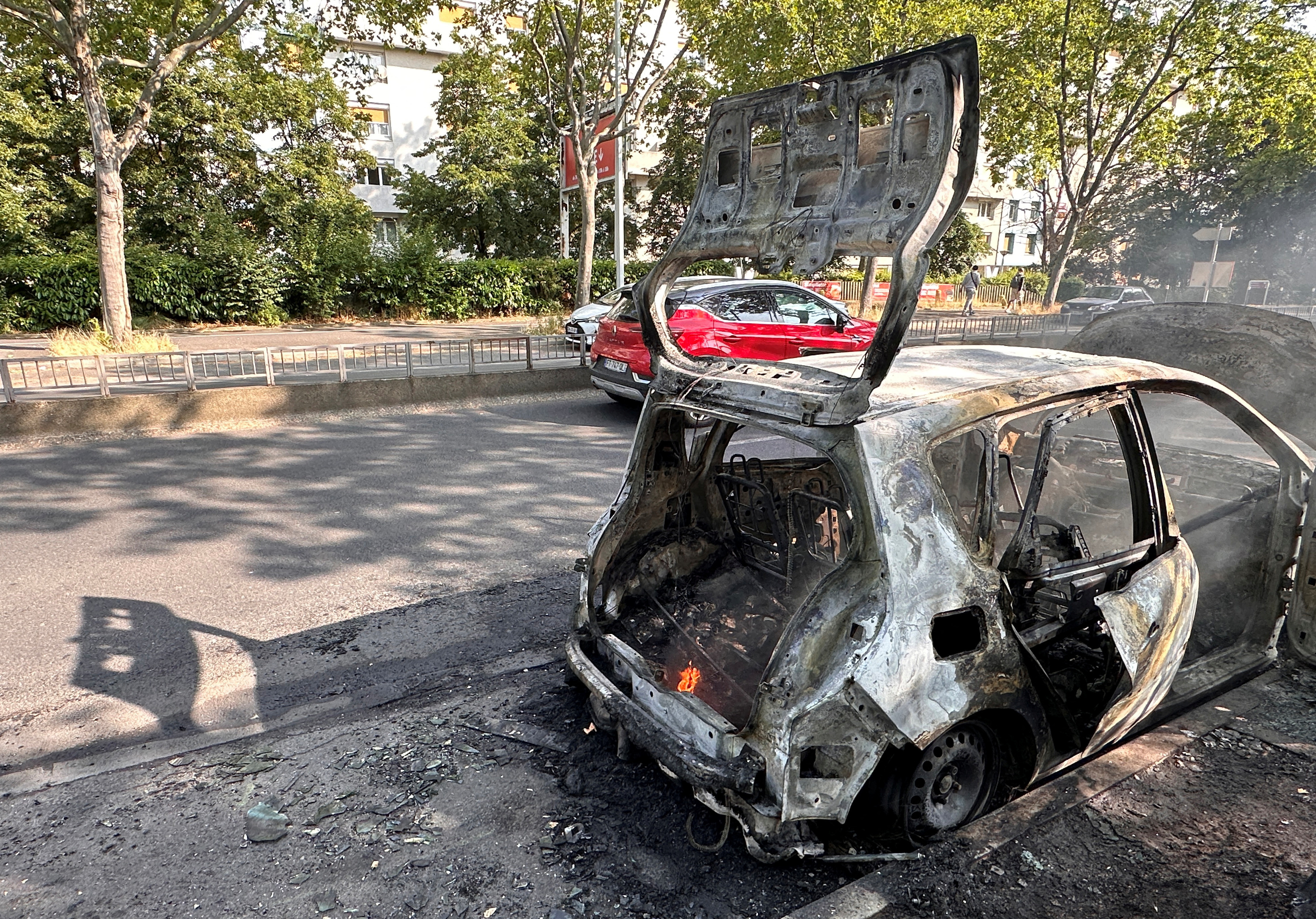午夜前不久,南特尔的巴勃罗·毕加索大道上,一串翻倒的车辆在燃烧,烟花在警察阵线上嘶嘶作响。