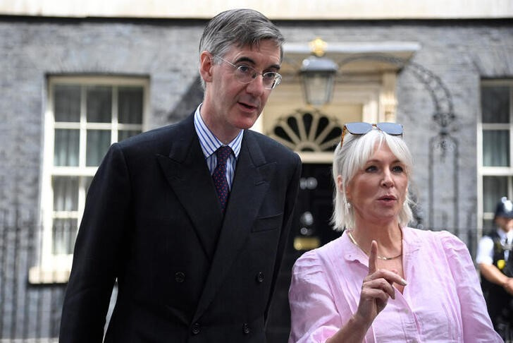 英国脱欧机遇和政府效率大臣雅各布·里斯-莫格和文化大臣娜丁·多里斯在伦敦唐宁街外向媒体发表声明,图片拍摄于2022年7月12日。路透社/Toby Melville