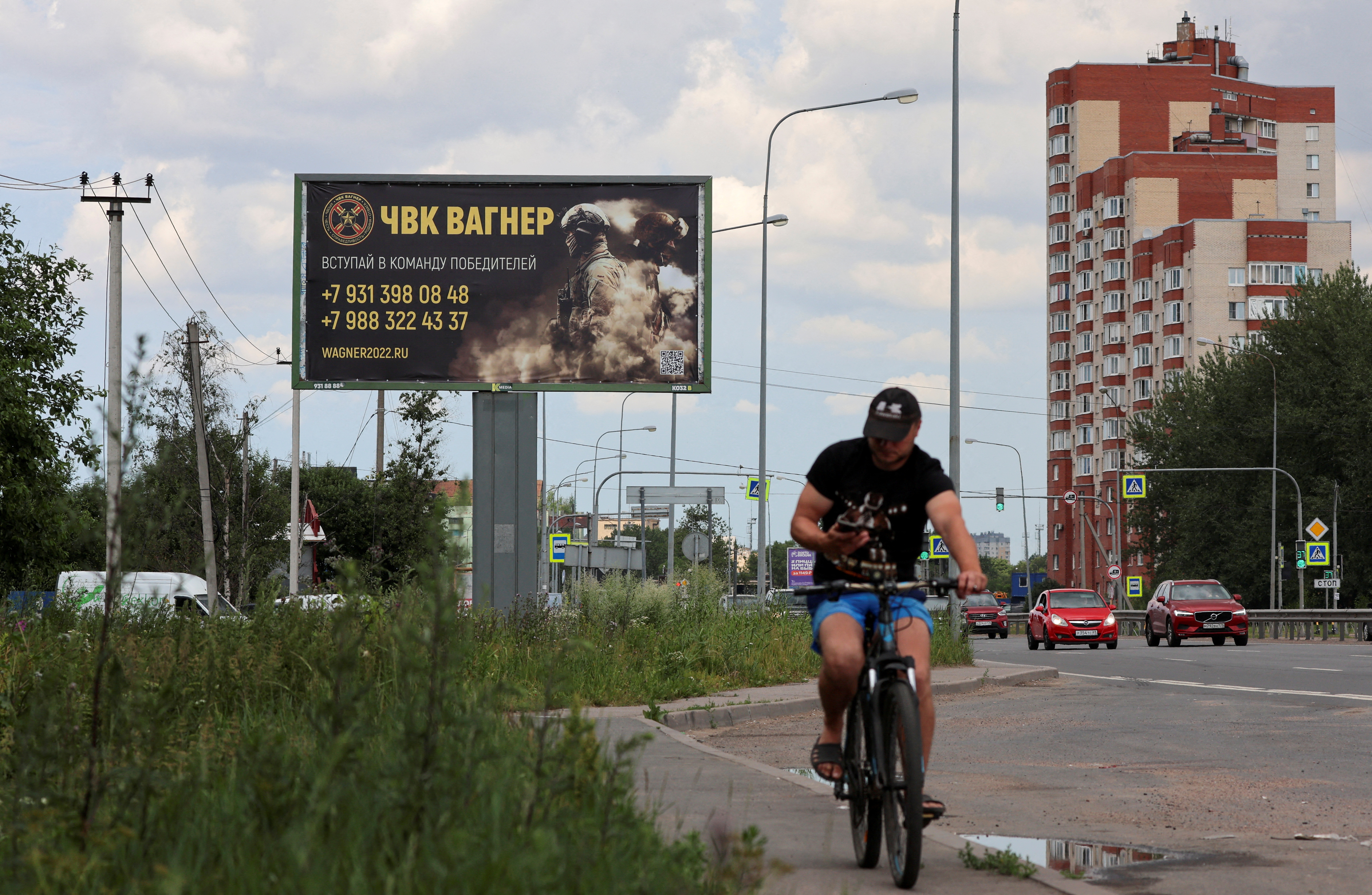 一个宣传牌,宣传瓦格纳私人雇佣军团的服务,在俄罗斯圣彼得堡的路边展示,2023年6月24日。牌子上的口号写着:“加入胜利者的团队!”路透社/Anton Vaganov/文件照片