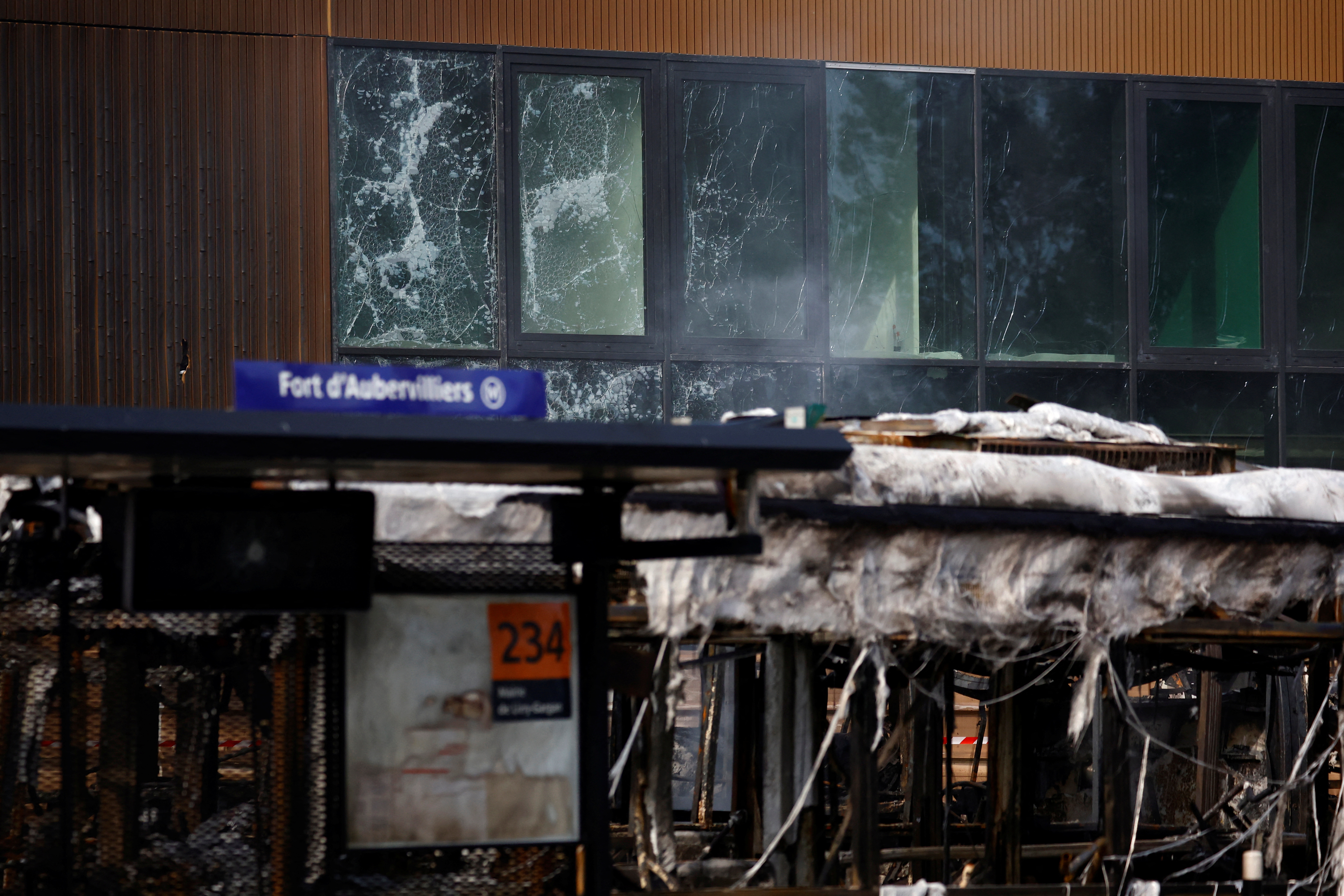 巴黎2024年奥运会游泳馆工地的损坏窗户景象,附近的RATP公交车站在夜间抗议者与警察发生冲突后受损,此次冲突是因为一名17岁少年Nahel在Nanterre被法国警察在交通检查中开枪打死… 阅读更多