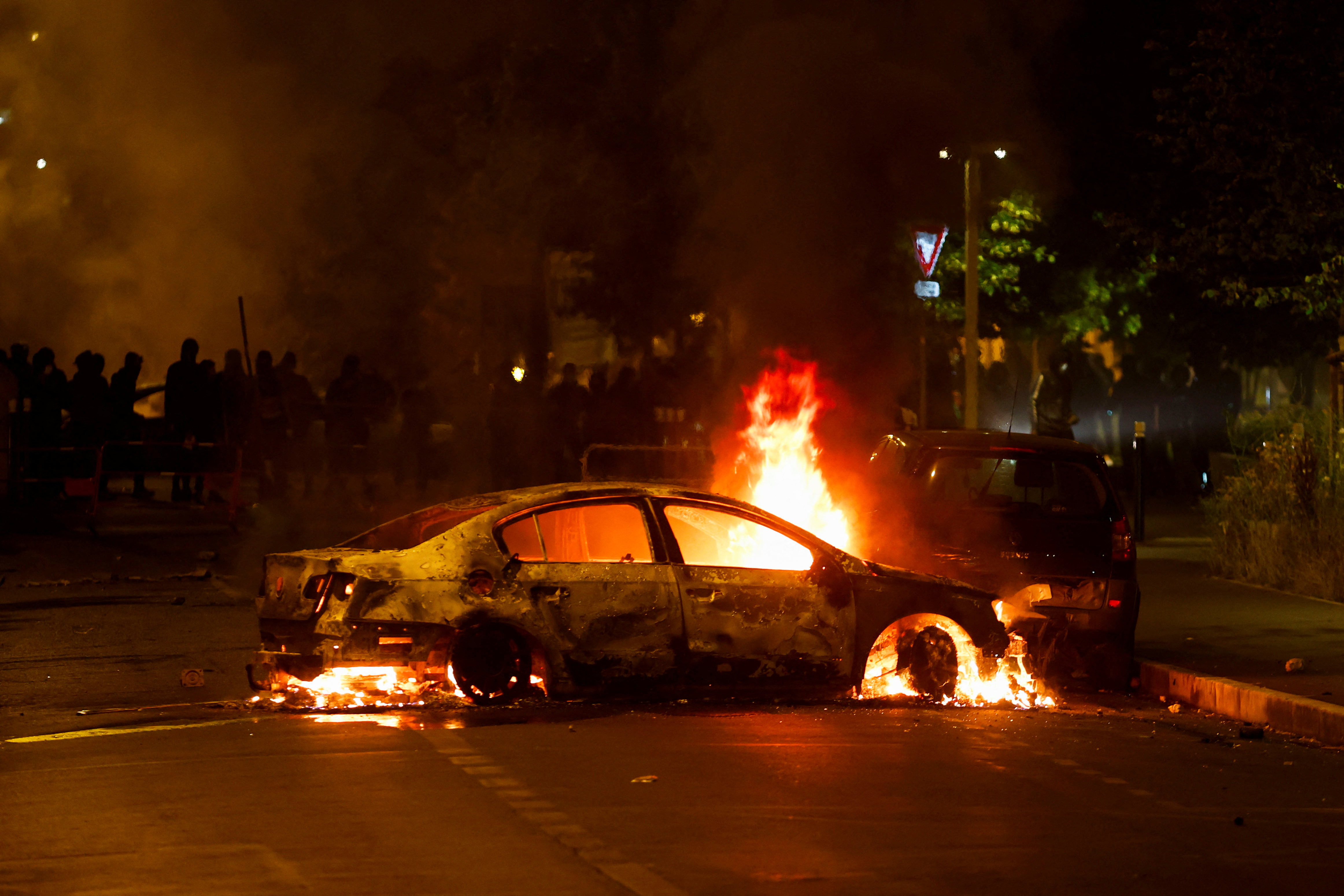 在巴黎西部郊区的工人阶级城镇纳特尔,周二,17岁的纳赫尔·M被枪杀,抗议者焚烧汽车,设路障,向警察投掷抛射物,之前进行了一次和平的守夜。