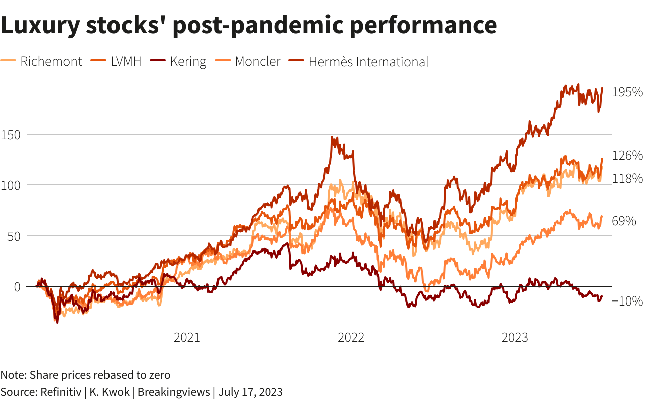 伦敦,7月17日(路透社Breakingviews)——Compagnie Financiere Richemont (CFR.S)正在测试奢侈品对经济衰退的免疫力的极限。这家市值930亿美元的瑞士奢侈品集团在周一报告称,截至6月的三个月内,美国的收入同比下降了2%,股价下跌了10%。其他大型奢侈品公司的股价也出现了下跌,包括市值2360亿美元的爱马仕国际(HRMS.PA)和市值5020亿美元的路威酩轩(LVMH.PA),分别下跌了4.2%和3.7%。