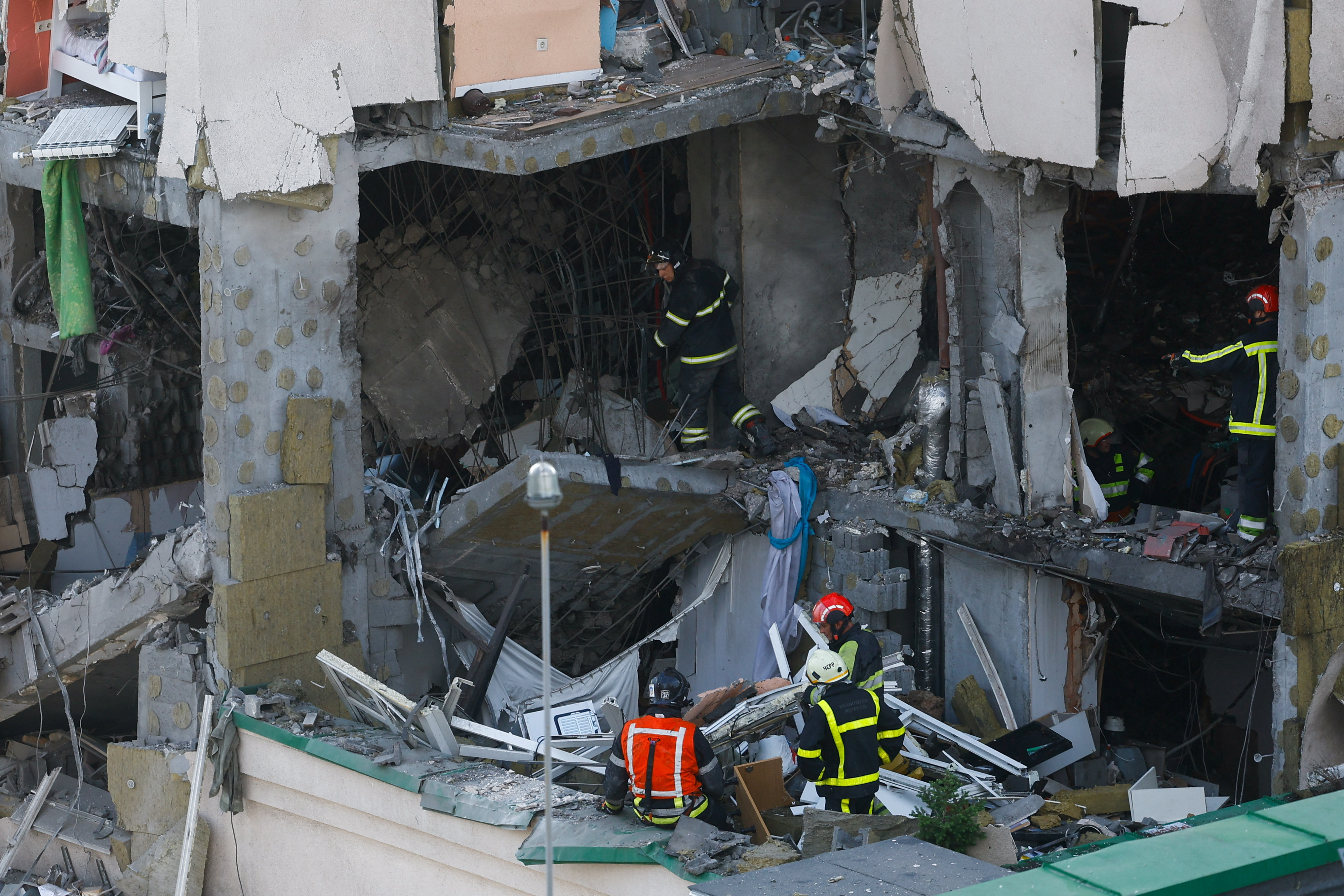救援人员在乌克兰基辅一栋公寓楼遭到俄罗斯导弹袭击后的现场工作,2023年6月24日。路透社/瓦伦廷·奥吉连科