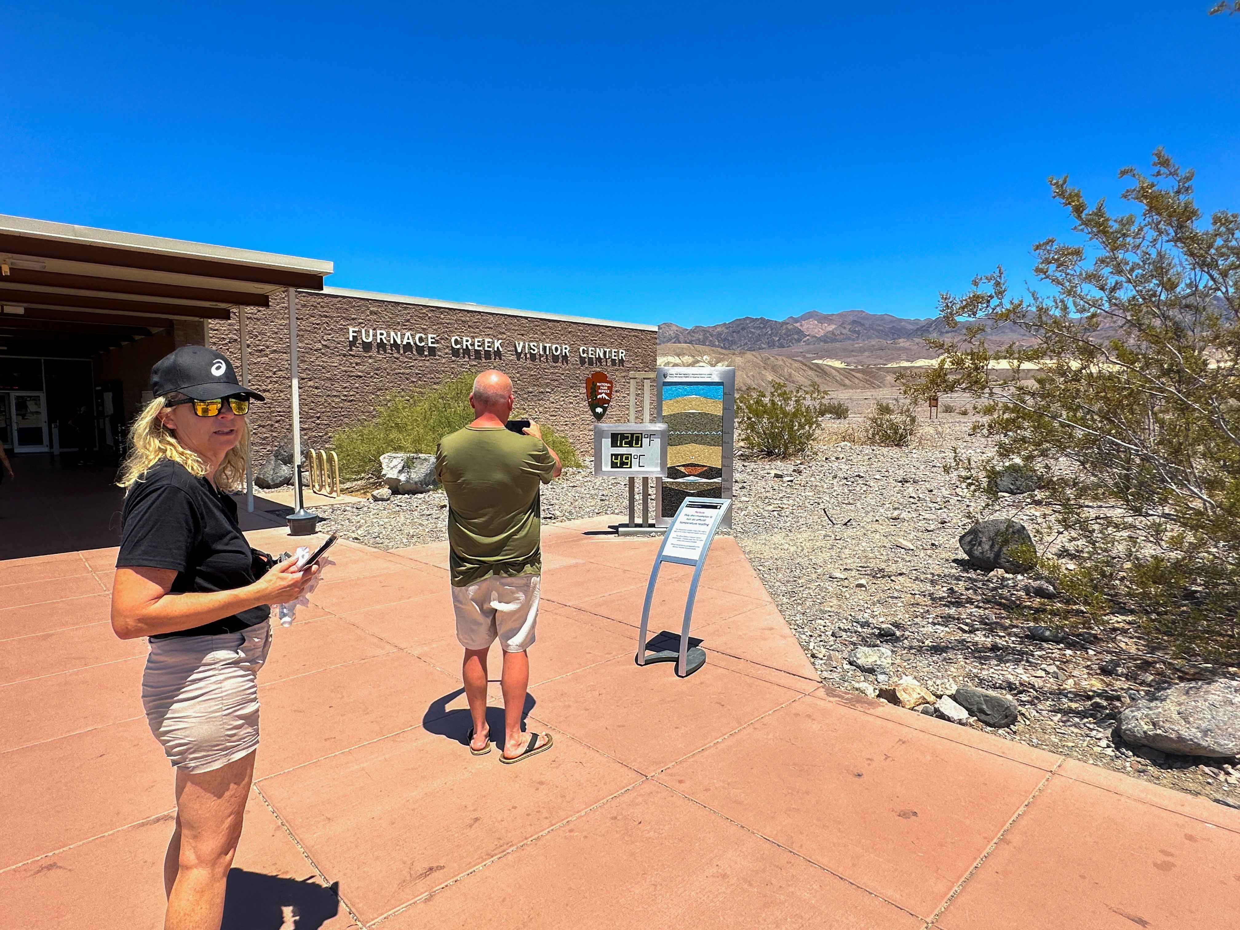 大约两打游客聚集在标志周围,期待见证历史的创造,当数字显示屏上的132变成了133时,他们欢呼雀跃。人们纷纷拍照,而美国国家公园的护林员则在一旁守候,以防有人受不了酷热。