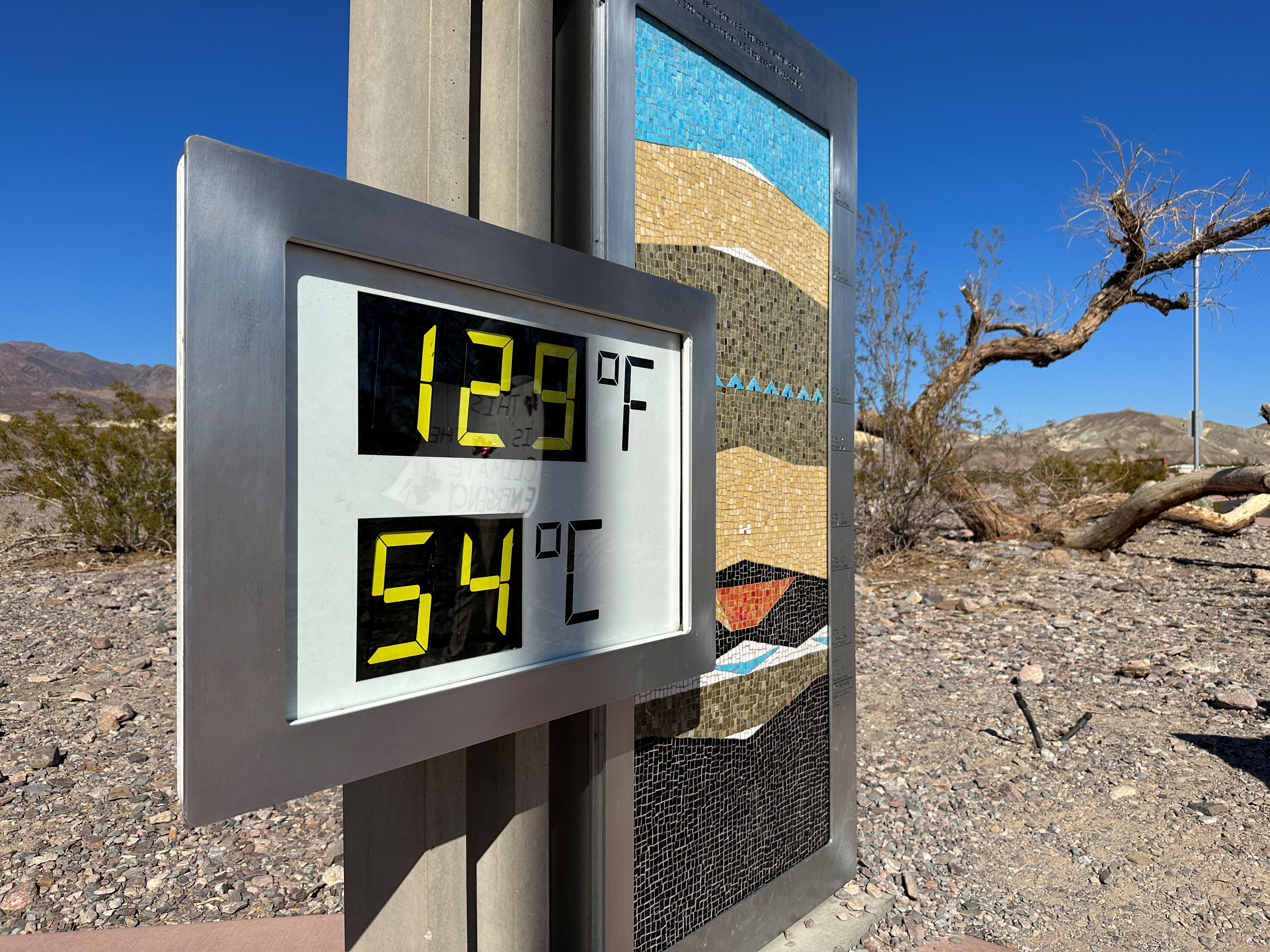 加利福尼亚的死亡谷周日正式达到了128华氏度(53摄氏度),根据国家气象局的数据,尽管著名的温度显示牌在炉石溪游客中心外显示为133华氏度(56摄氏度)。