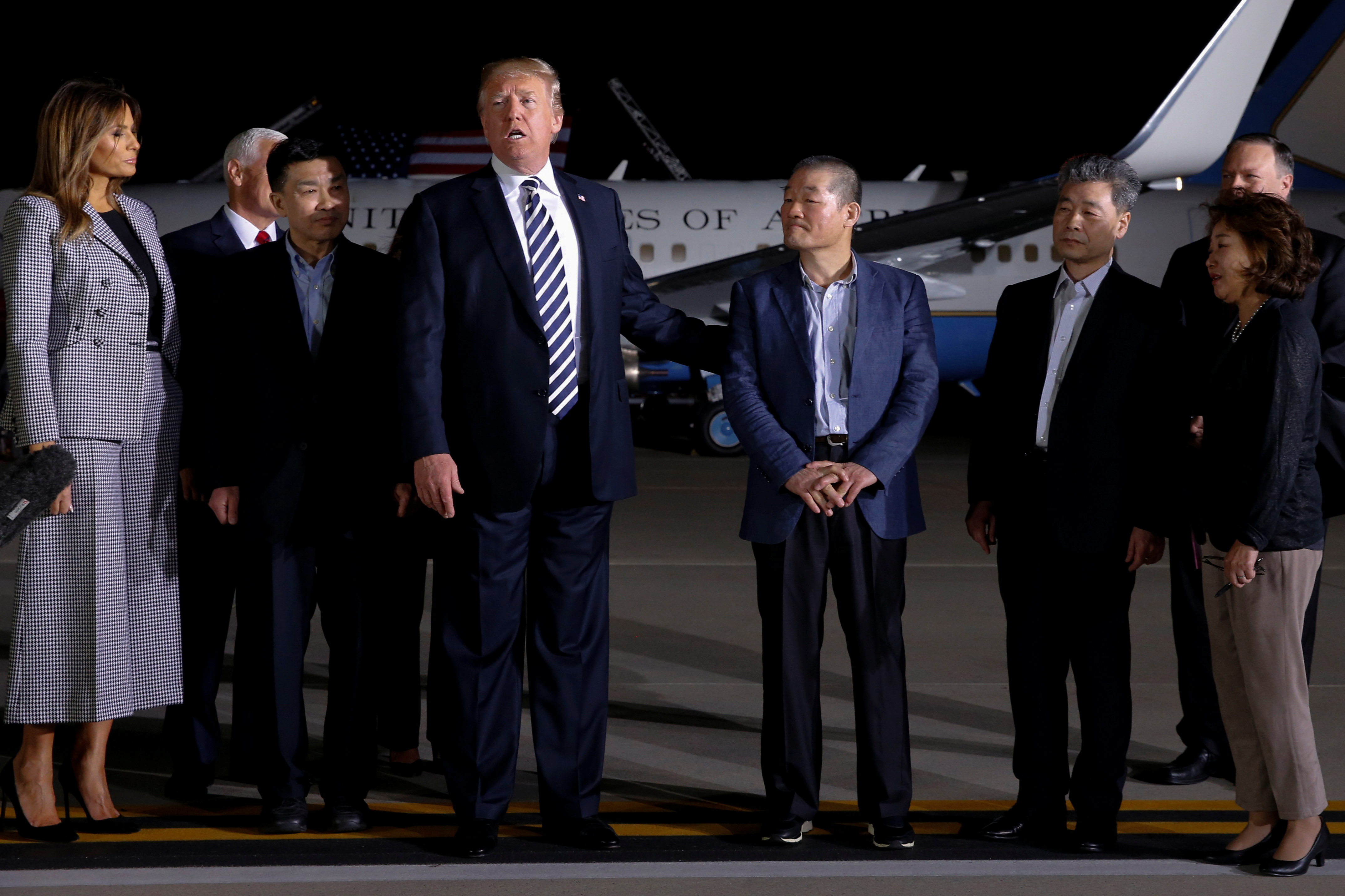 美国总统唐纳德·特朗普与美国从朝鲜被释放的托尼·金、金学松和金东哲在美国马里兰州安德鲁斯联合基地抵达时向媒体发表讲话,2018年5月10日。路透社/乔纳森·恩斯特/文件照片