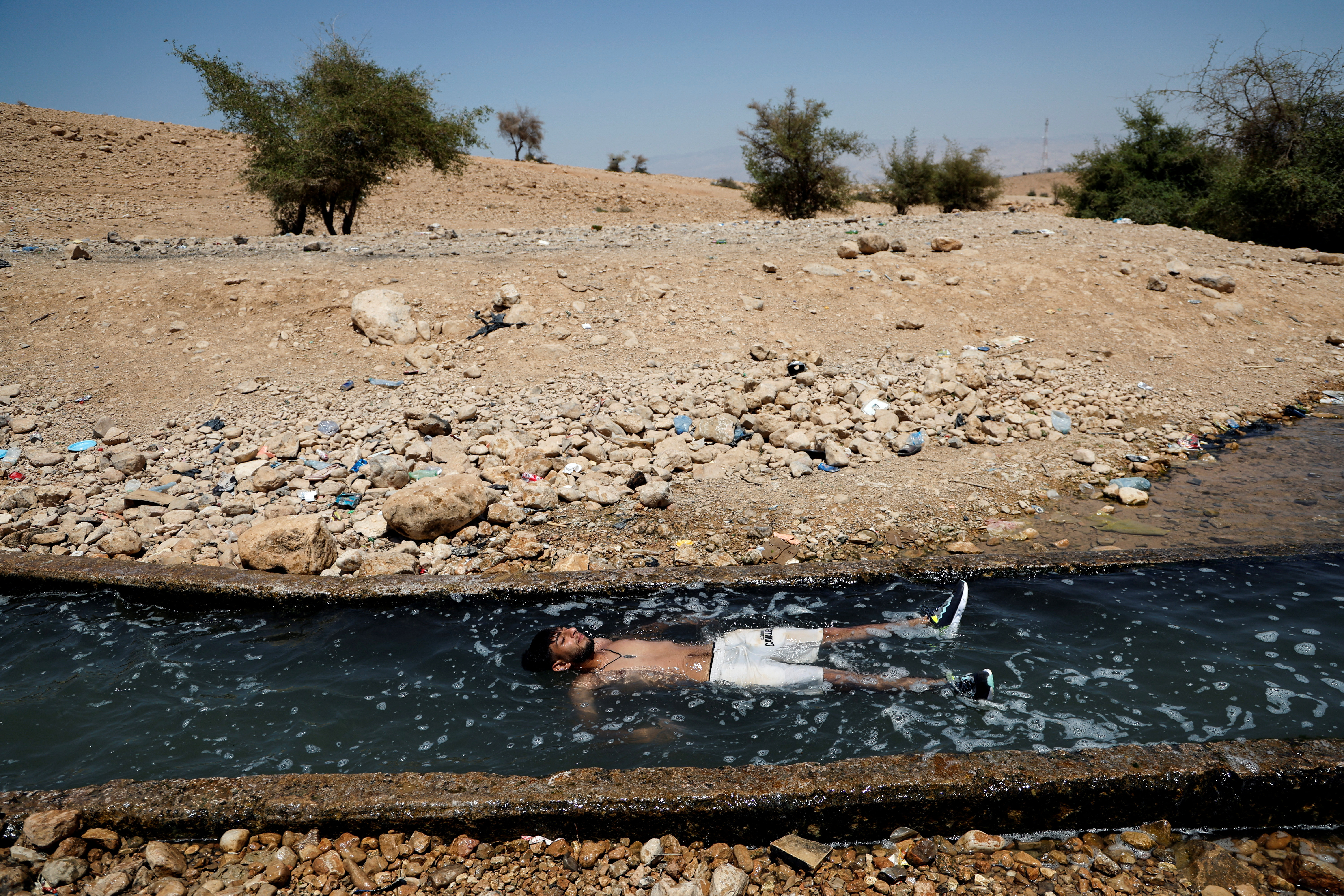 巴勒斯坦一名男子在以色列占领的约旦河西岸杰里科附近的阿尔奥贾泉中降温,7月18日。路透社/阿玛尔·阿瓦德