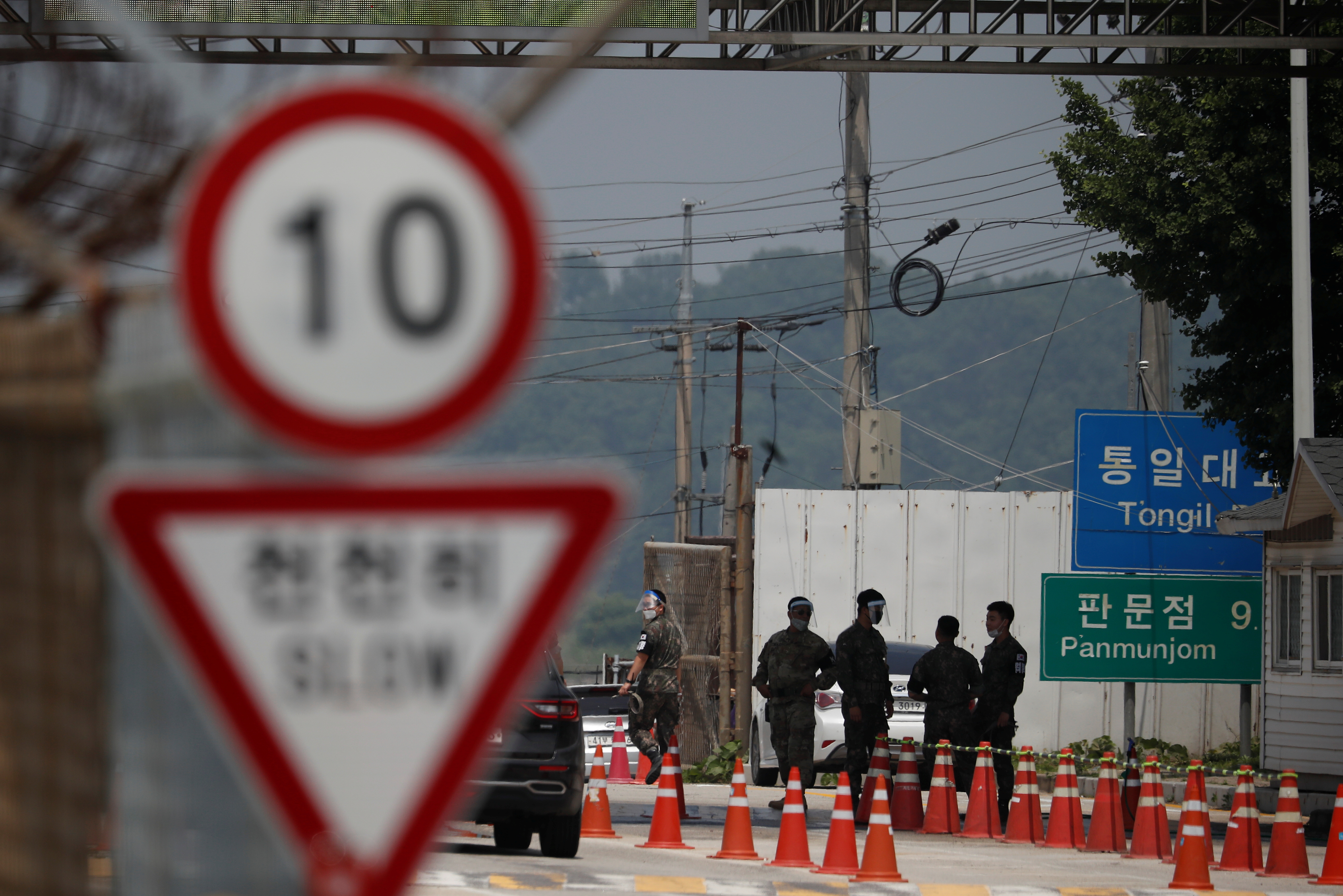 士兵们在通往朝鲜开城工业园区的大一统桥上执勤,该工业园区位于朝韩两国分界线以南的非军事区,2020年6月17日,韩国坡州。路透社/Kim Hong-Ji摄