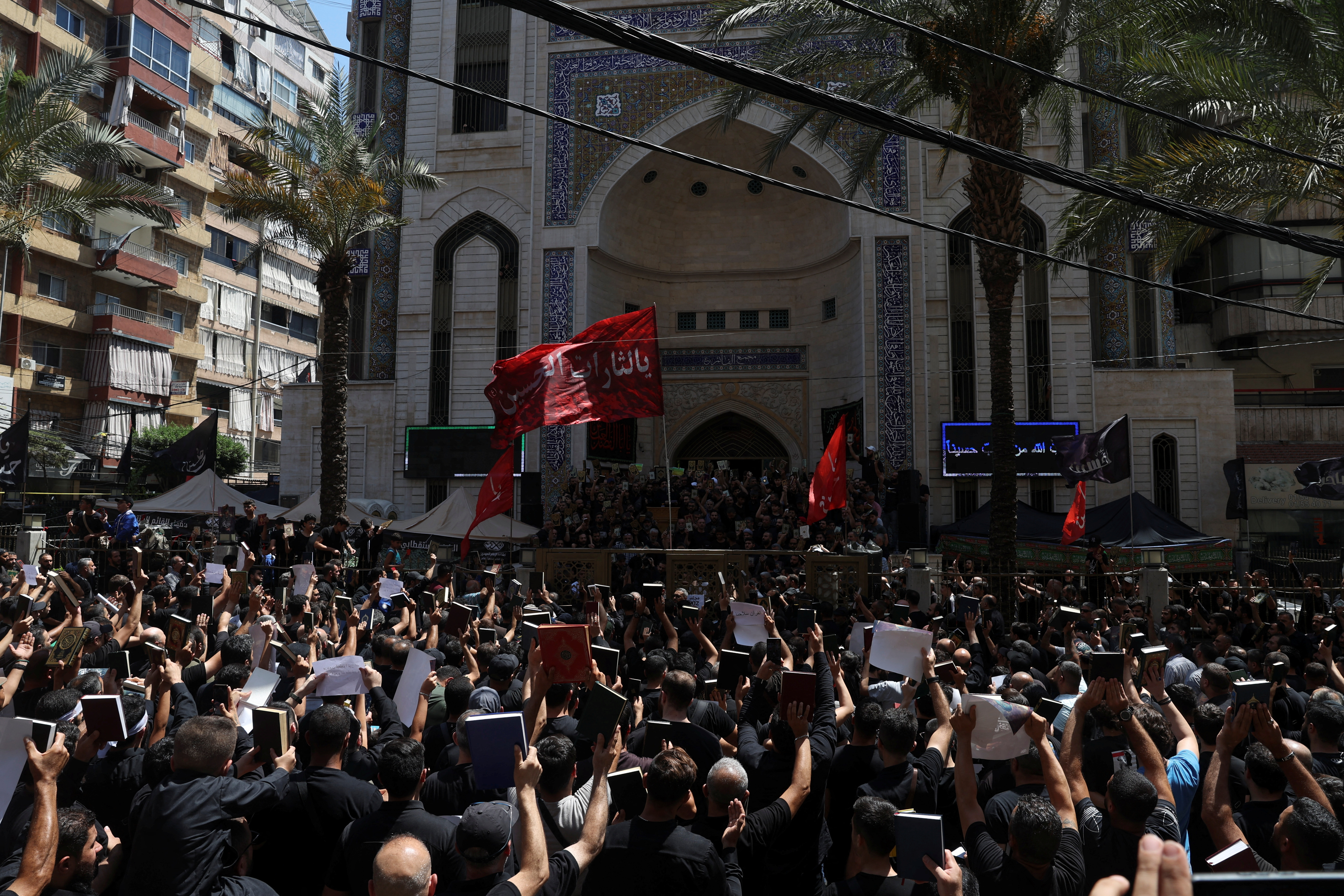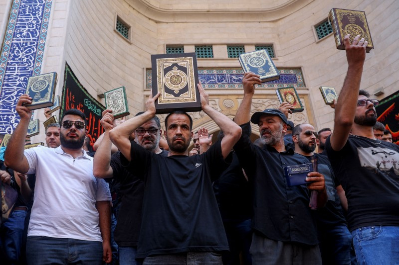 黎巴嫩穆斯林参加什叶派组织真主党发起的示威活动,谴责真主党领袖称前一天反伊斯兰抗议者在瑞典亵渎古兰经,在黎巴嫩贝鲁特南部郊区,2023年7月21日。路透社/Emilie Madi