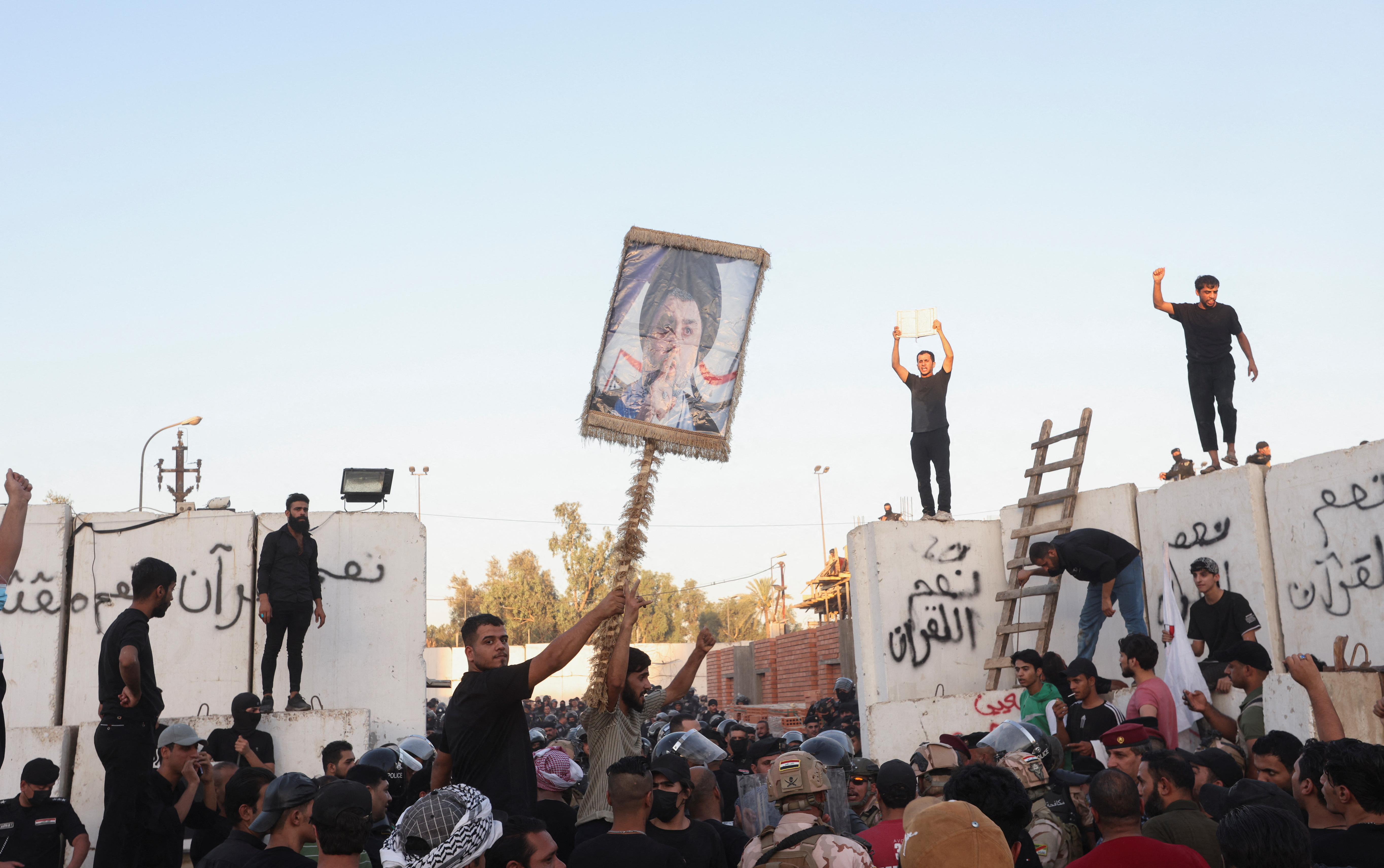 一名抗议者举起伊拉克什叶派教士穆克塔达·萨德尔的肖像,当瑞典大使馆附近的抗议活动中,瑞典大使馆的建筑冒着烟,这是在预期的斯德哥尔摩烧毁古兰经之前的几个小时,伊拉克巴格达,2023年7月20日…. 阅读更多