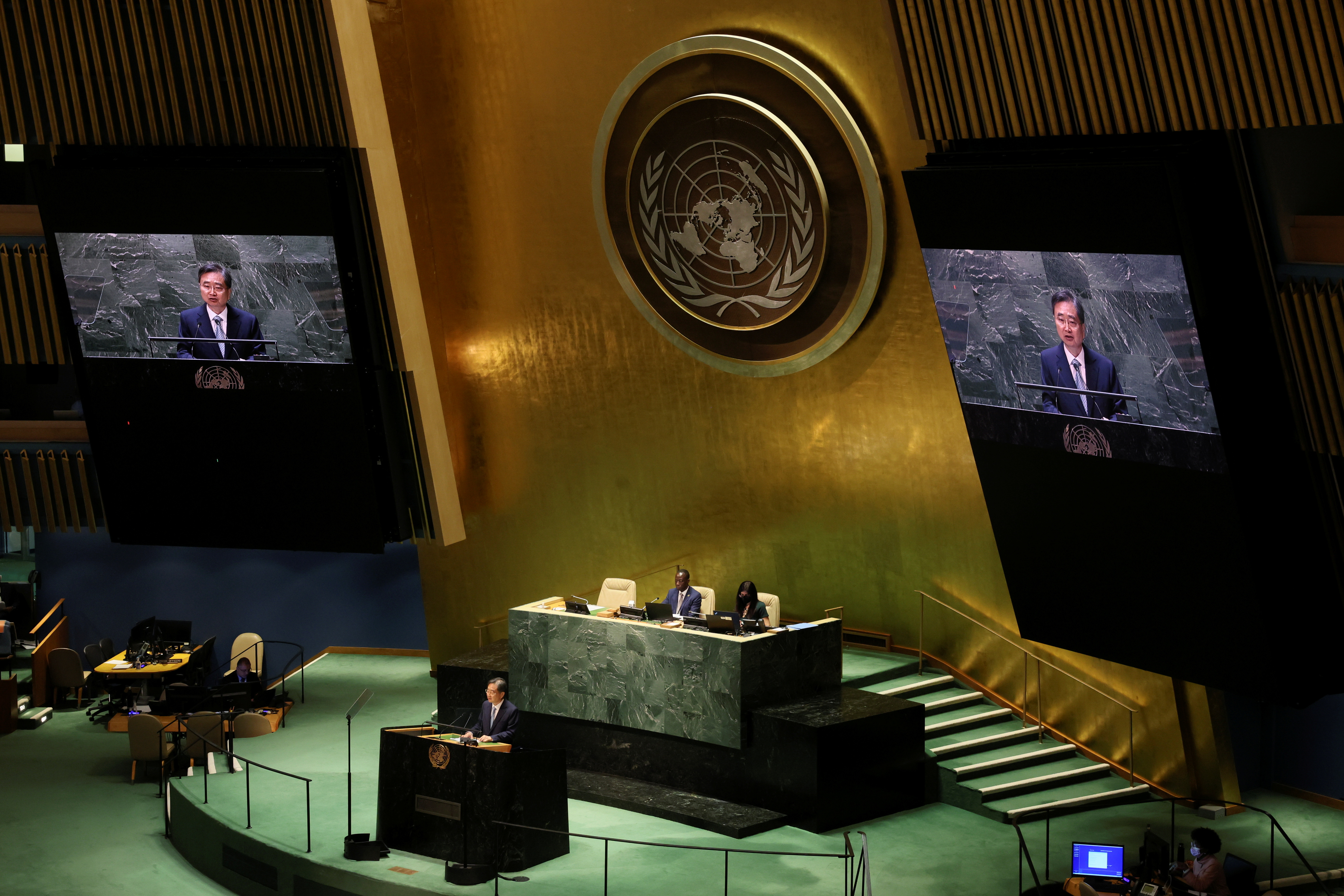 韩国驻联合国大使赵铉在中国和俄罗斯否决联合国安理会对朝鲜实施新制裁后,在纽约市联合国总部举行的联合国大会上发言,2022年6月8日。路透社/迈克·塞加尔/档案照片