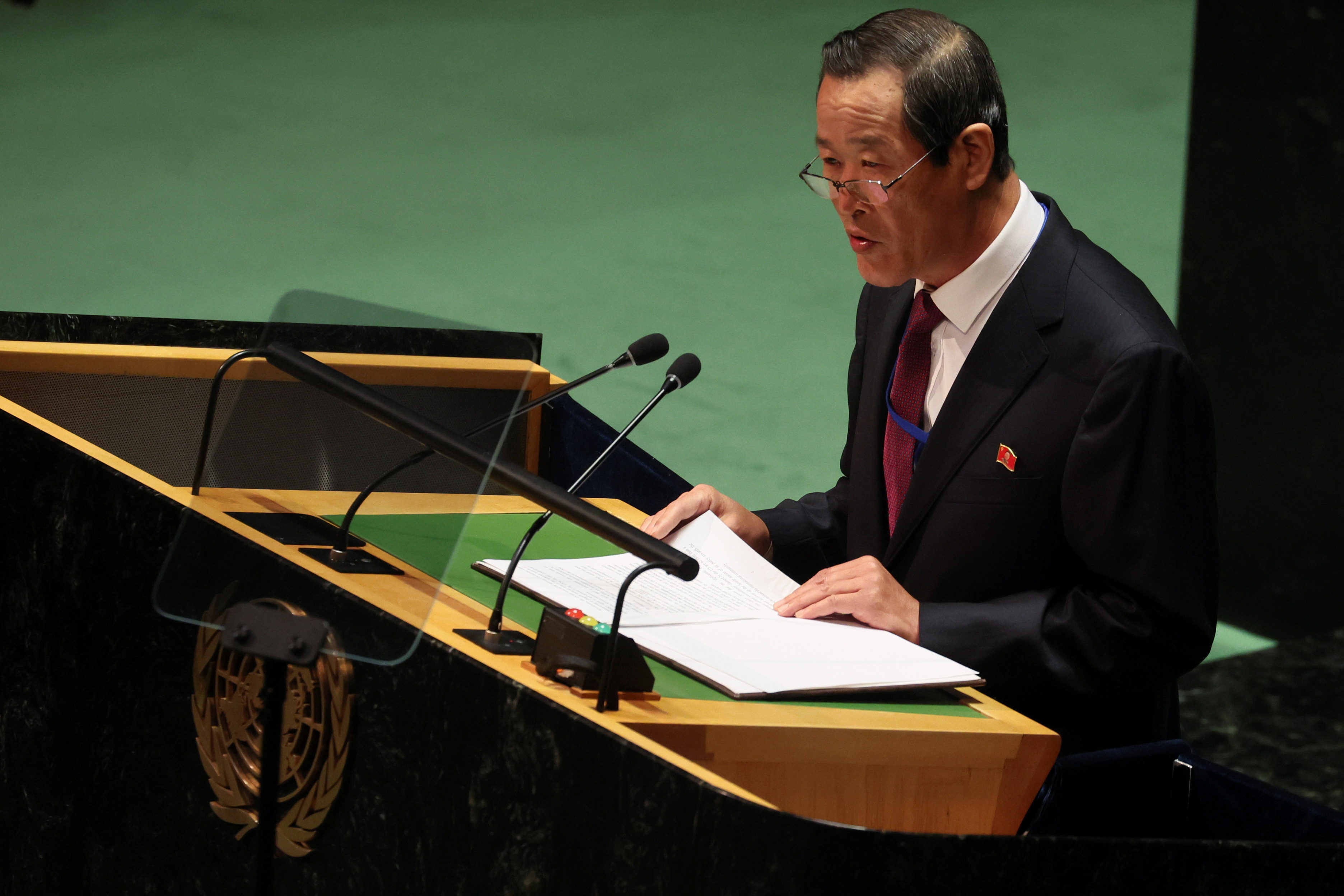 韩国驻联合国大使赵铉在中国和俄罗斯否决联合国安理会对朝鲜实施新制裁后,在纽约市联合国总部举行的联合国大会上发言,2022年6月8日。路透社/迈克·塞加尔/档案照片