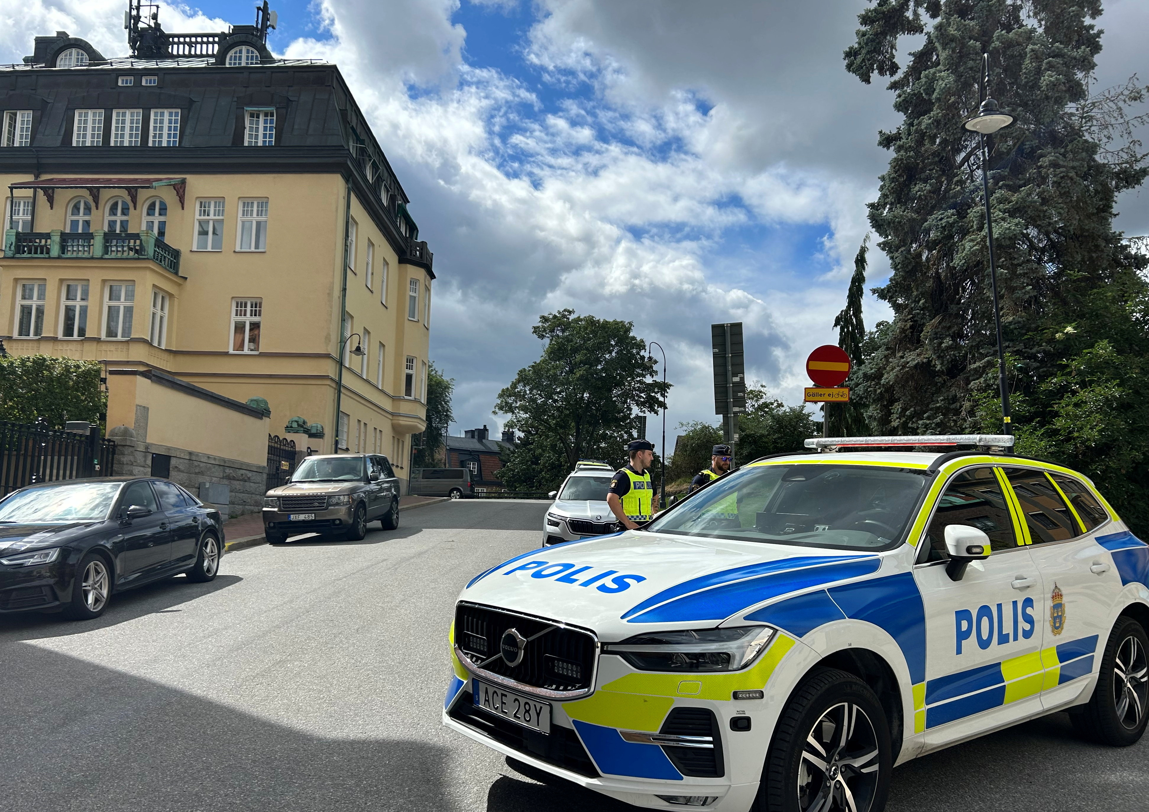 警察在瑞典斯德哥尔摩伊拉克大使馆附近举行示威活动,2023年7月20日。路透社/苏潘萨·穆克吉