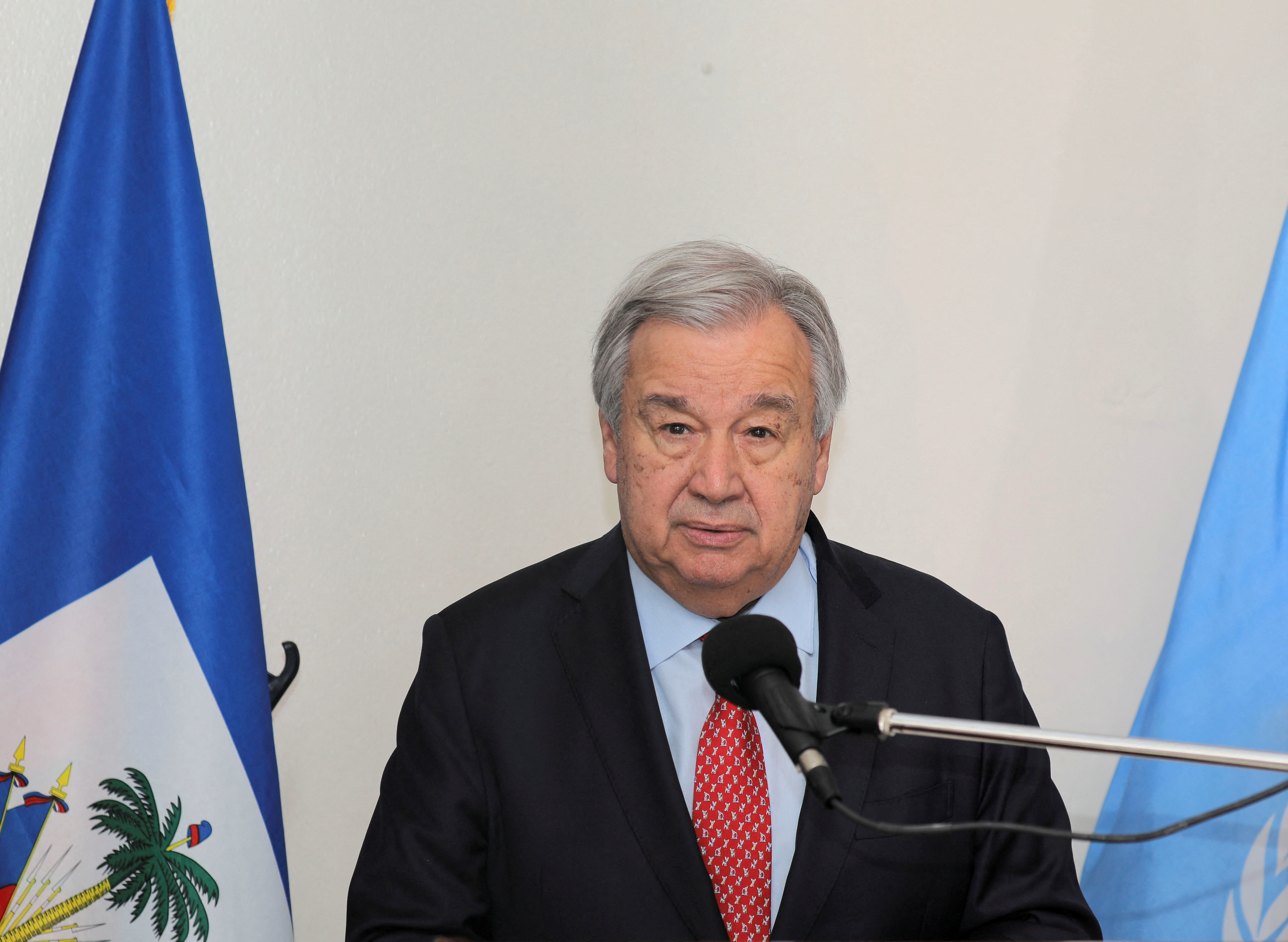 联合国秘书长安东尼奥·古特雷斯于2023年7月1日在海地太子港图桑·路易斯特国际机场外交休息室举行的新闻发布会上讲话。路透社/拉尔夫·泰迪·埃罗尔/文件照片