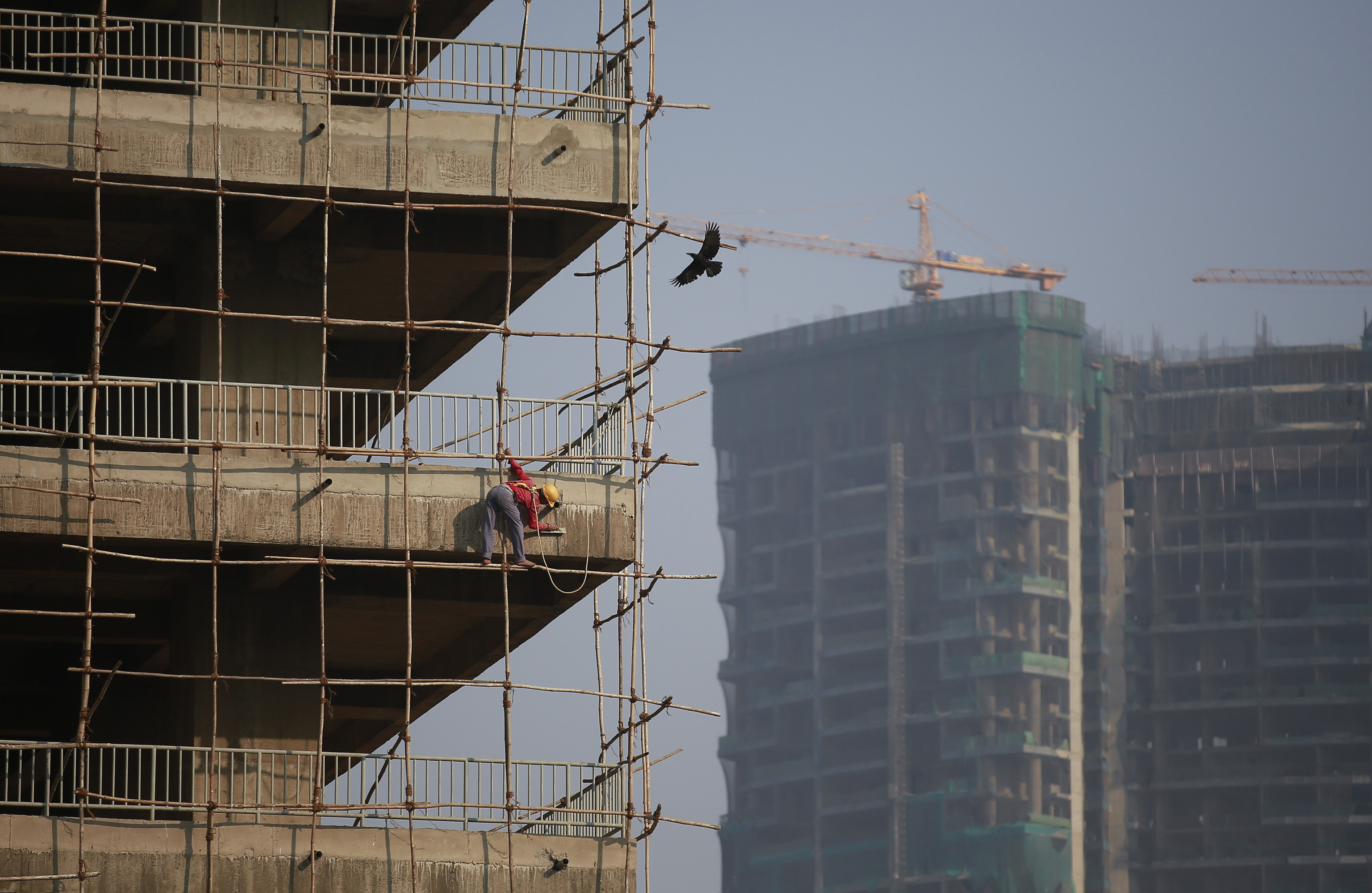 一名劳工站在木制脚手架上,在孟买中央金融区的商业建筑工地工作,2015年1月16日。路透社/丹尼什·西迪基/档案照片