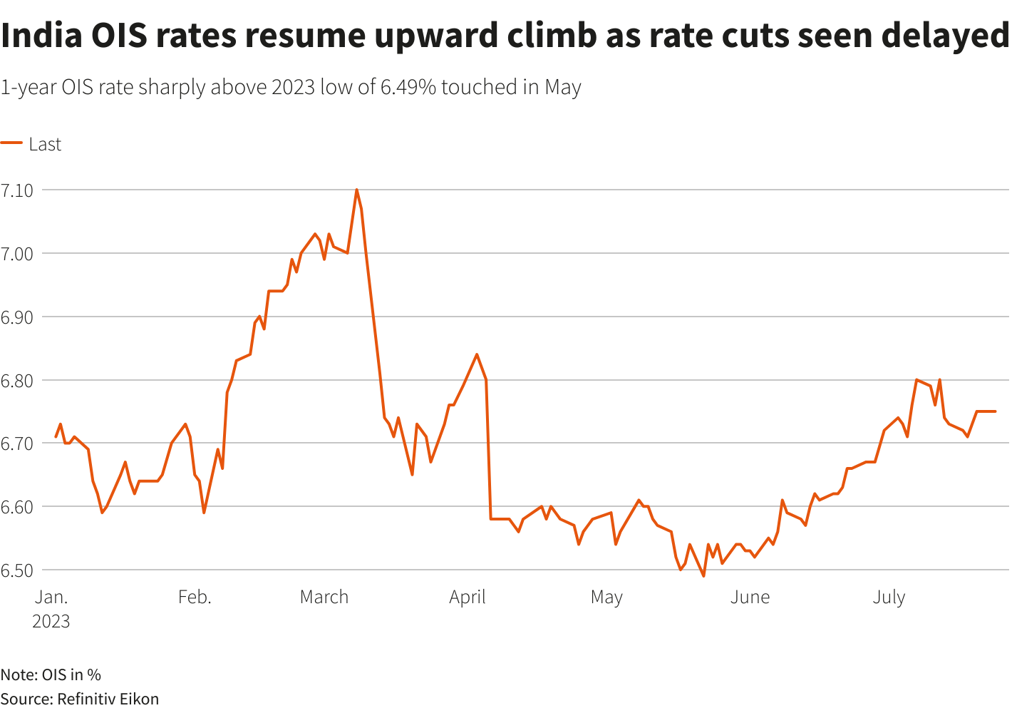 孟买,7月24日(路透社) - 最近通货膨胀上升促使印度投资者将降息预期至少推迟一个季度至2024年中期,交易员和分析师周一表示,如果价格持续上涨,可能会进一步重新定价。