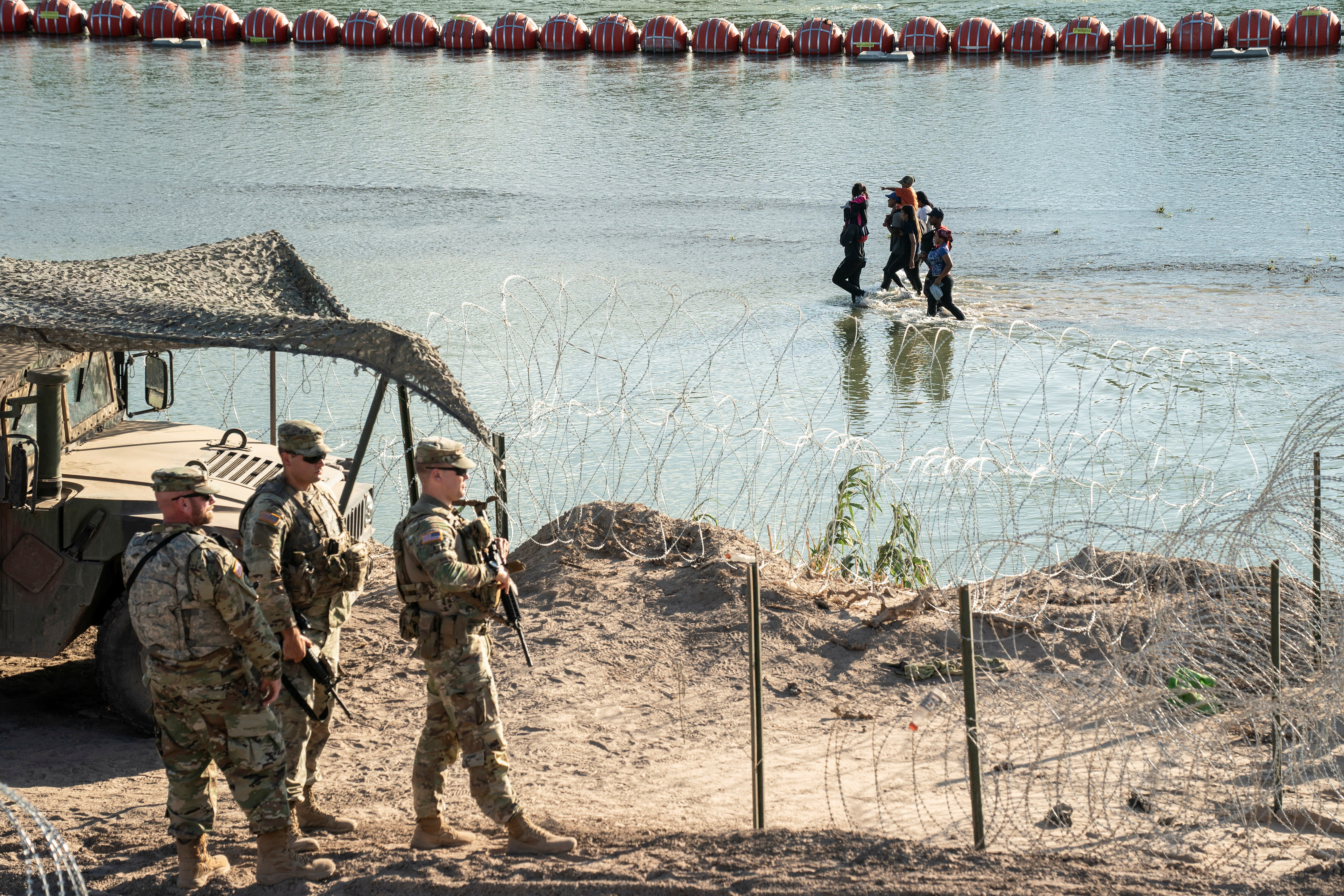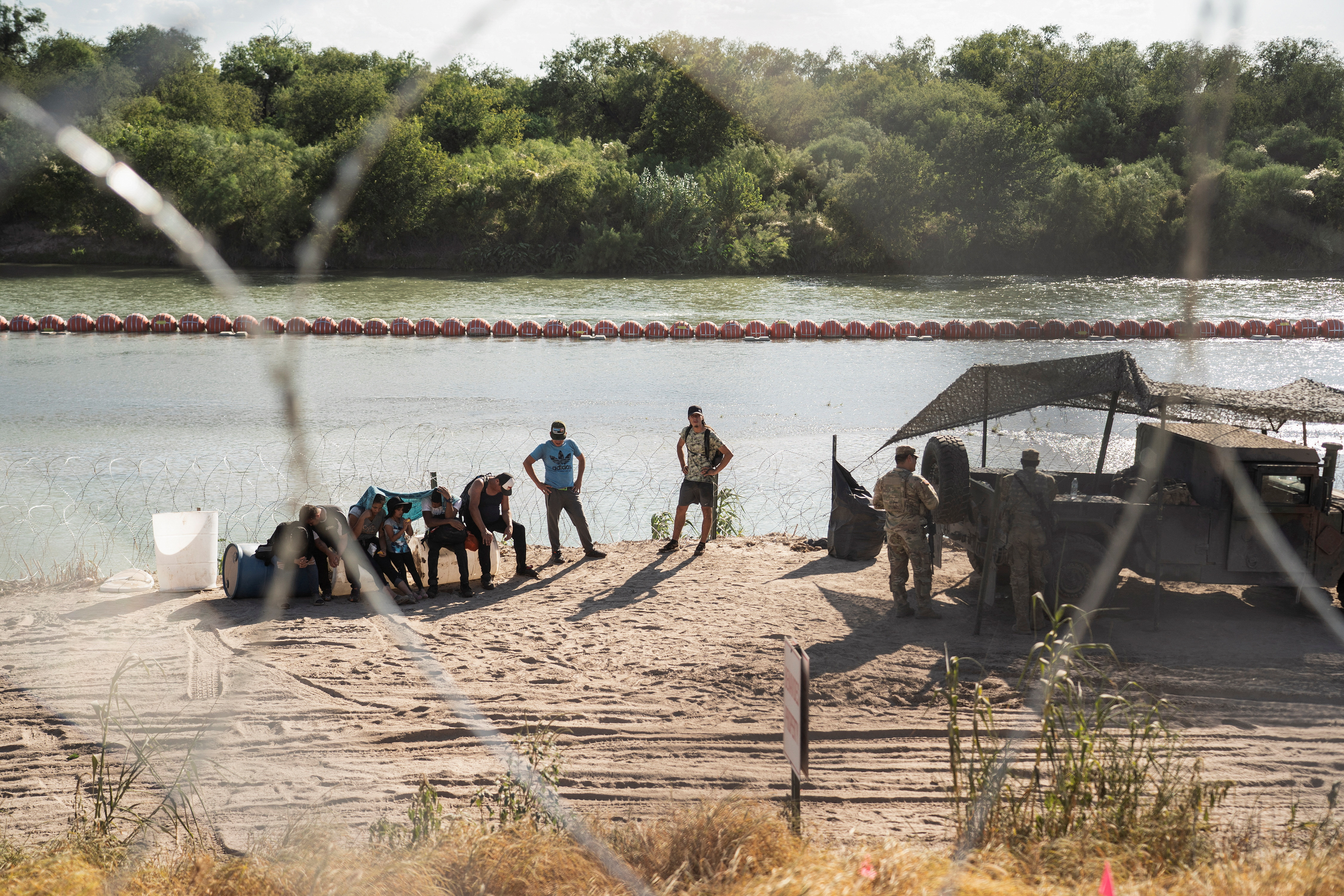 近几个月来,国民警卫队士兵已经悬挂了刺丝网,阻止移民越过格兰德河。