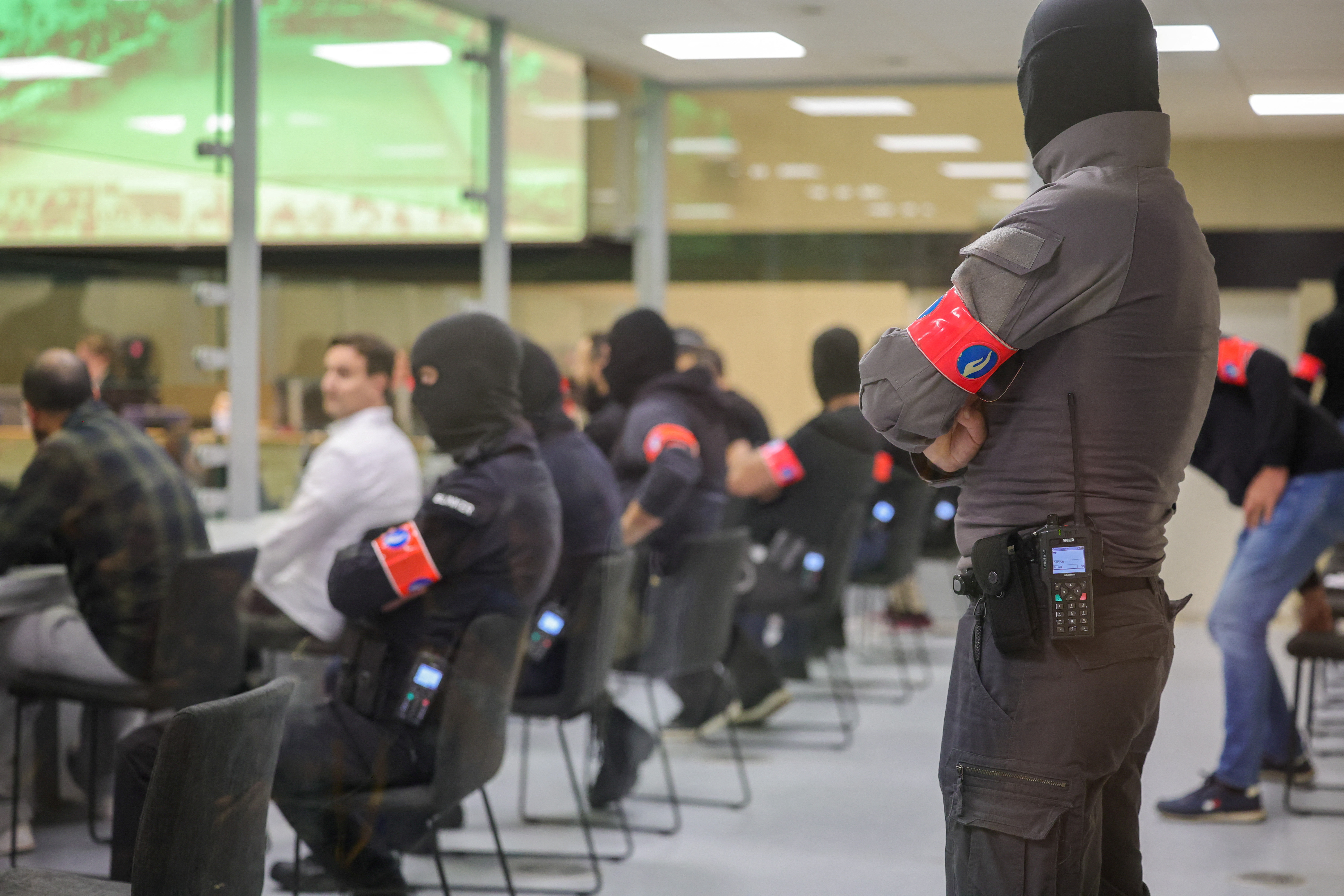 陪审团成员面对被告,其中七人坐在玻璃屏幕后面,由戴着面罩的警察守卫。