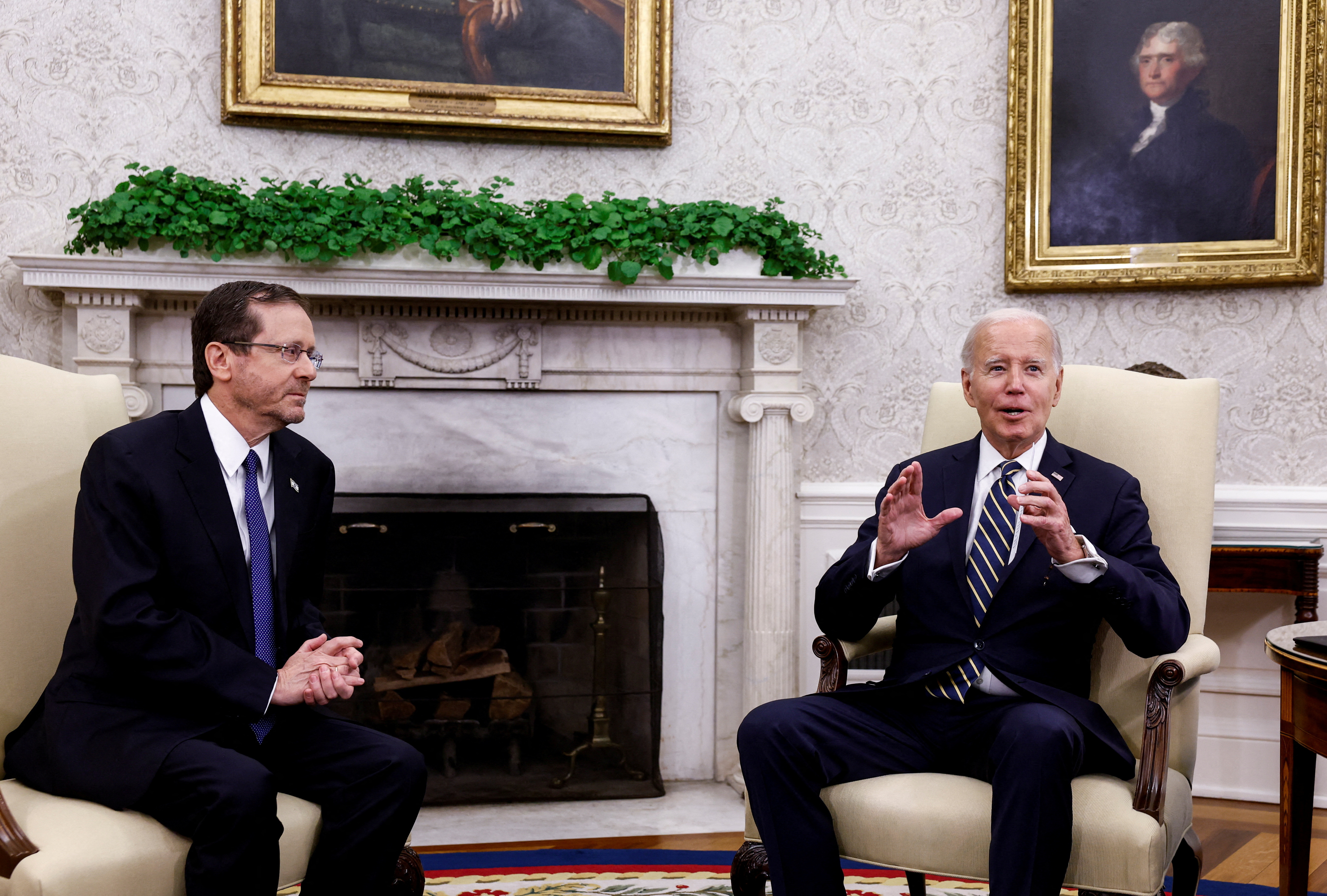 美国总统乔·拜登在白宫椭圆形办公室与以色列总统艾萨克·赫尔佐格会晤时讲话,华盛顿,美国,2023年7月18日。路透社/伊夫林·霍克斯坦/文件照片