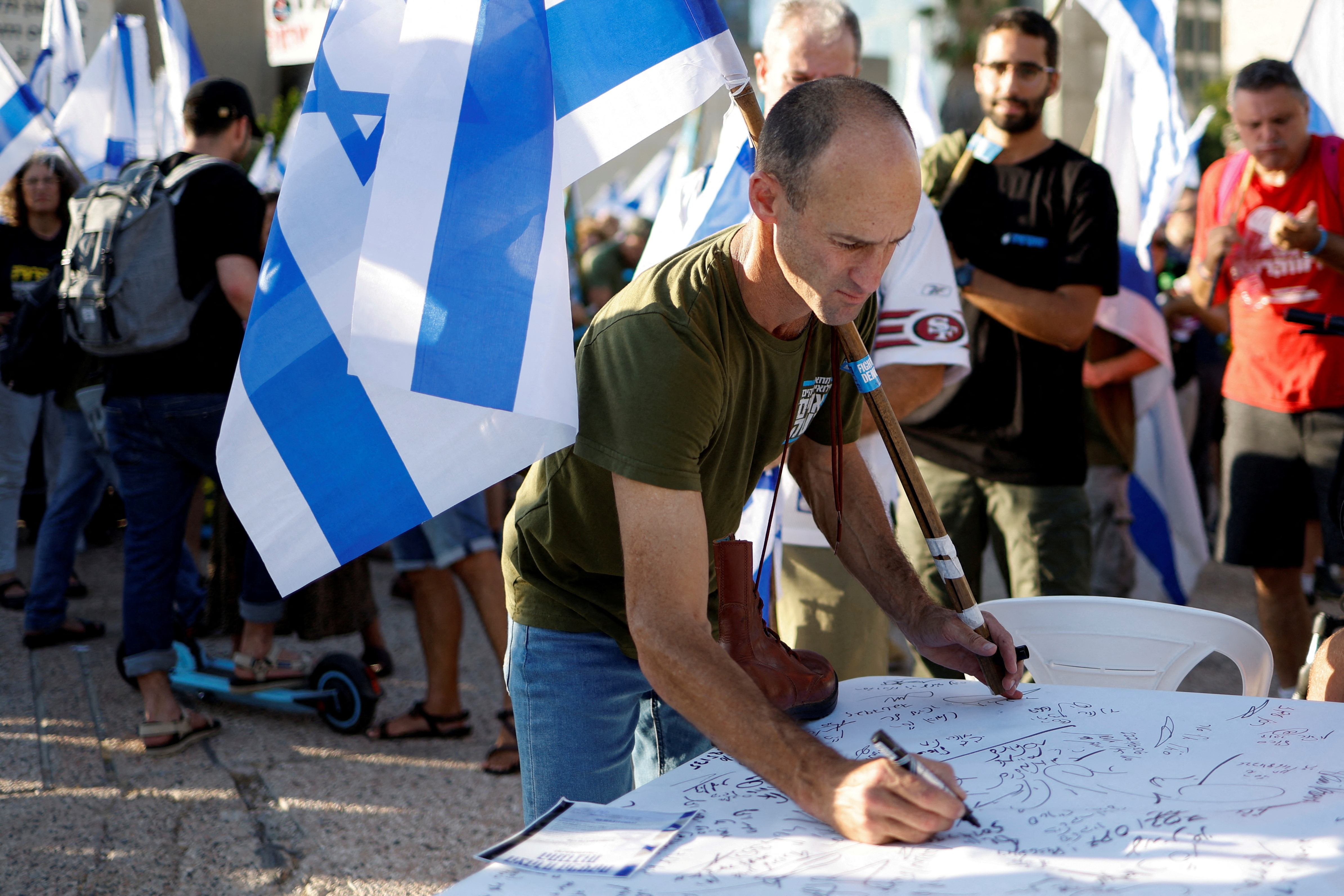 以色列预备役军人在特拉维夫国防部附近签署中止自愿服兵役的承诺,以抗议政府通过司法改革立法,2023年7月19日摄。路透社/阿米尔·科恩/档案照