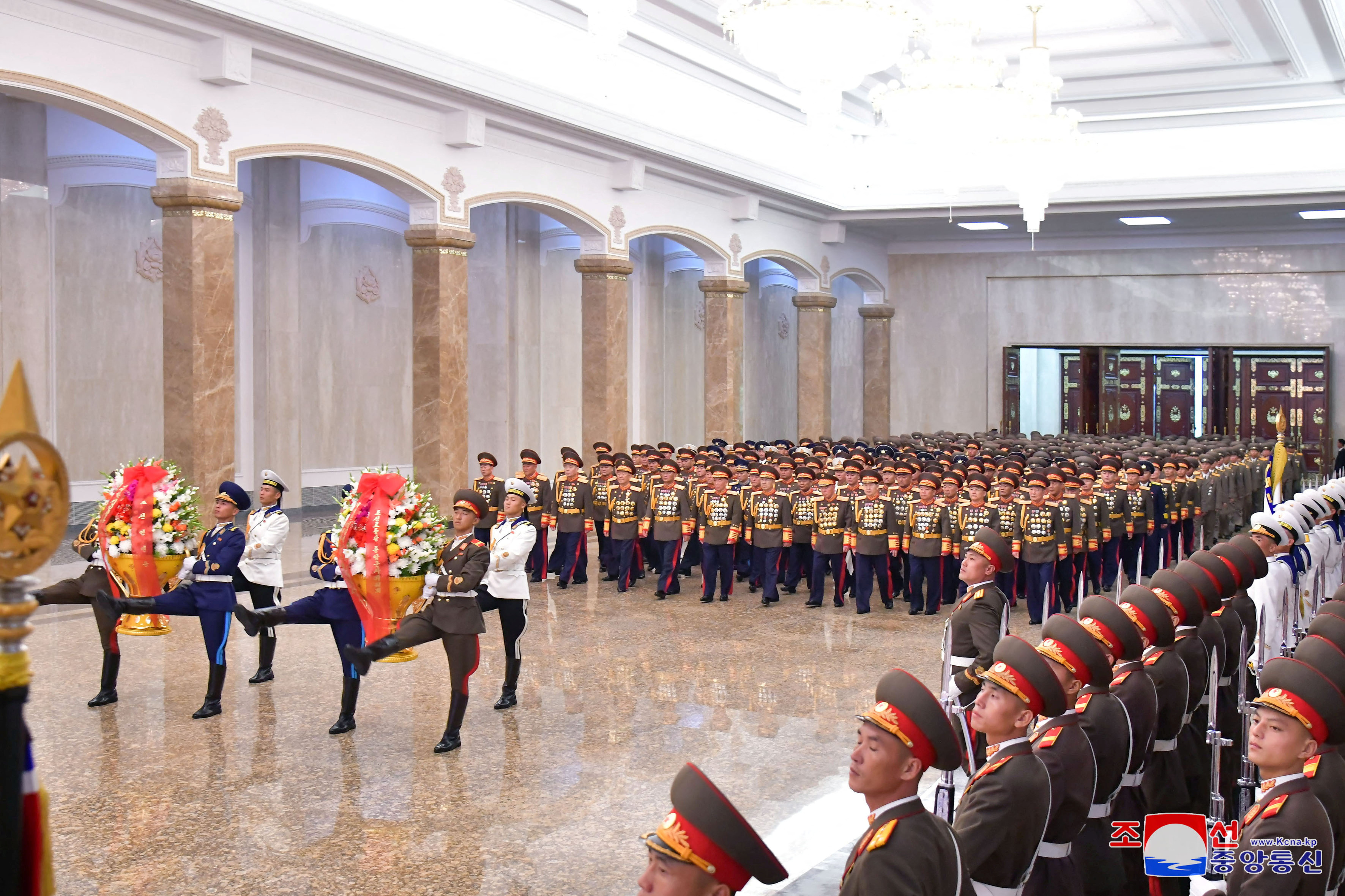 朝鲜人民军指挥官们参观了平壤的锦绣山太阳宫,以纪念朝鲜战争停战协定签订70周年,2023年7月25日,这张照片由朝鲜的朝鲜中央通讯社发布。 KCNA通过路透社