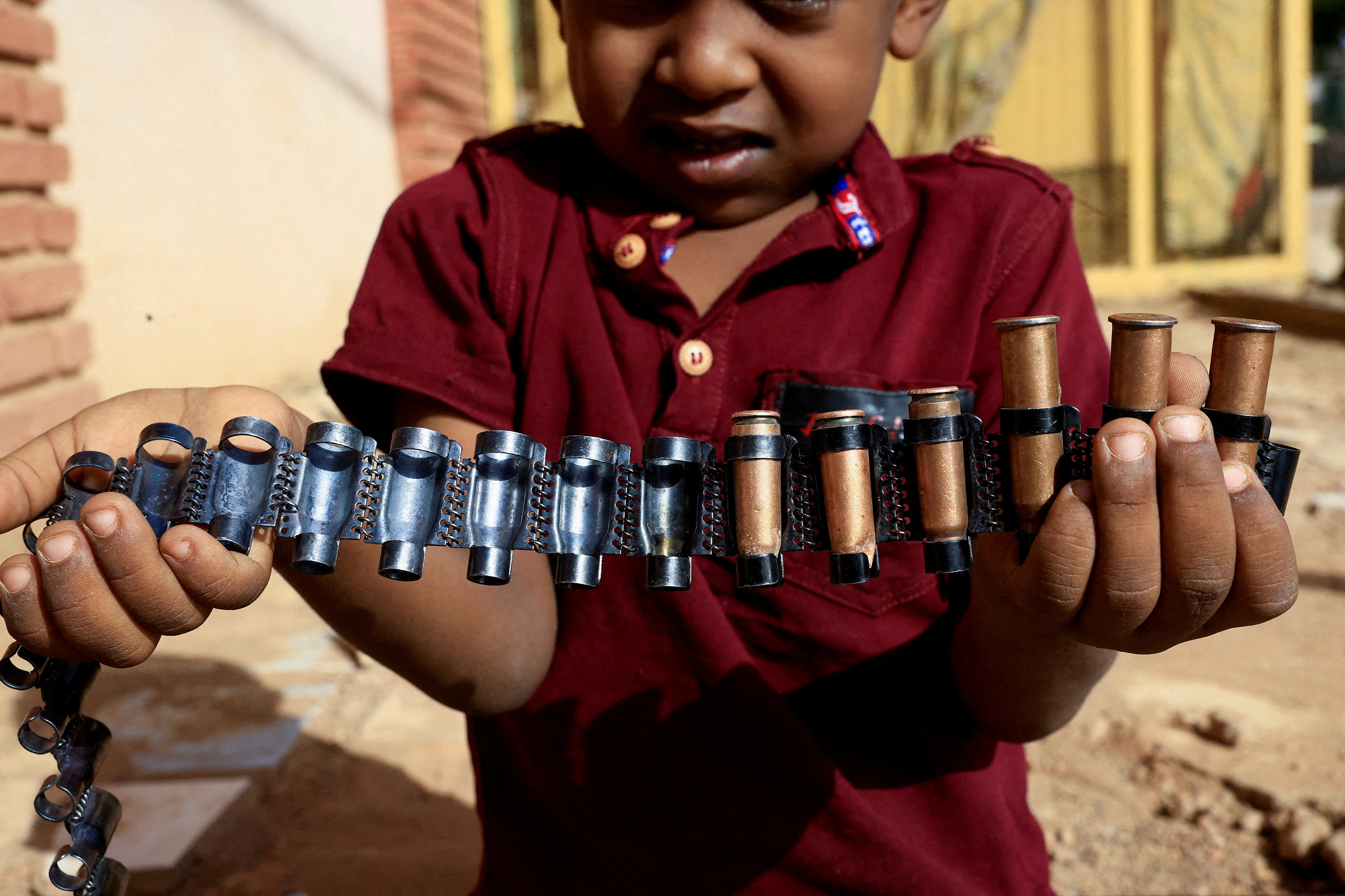在苏丹首都喀土穆北部的中央市场附近的受损建筑物旁,可以看到冲突中的炮弹。2023年4月27日,苏丹喀土穆北部,路透社/ Mohamed Nureldin Abdallah/文件照片