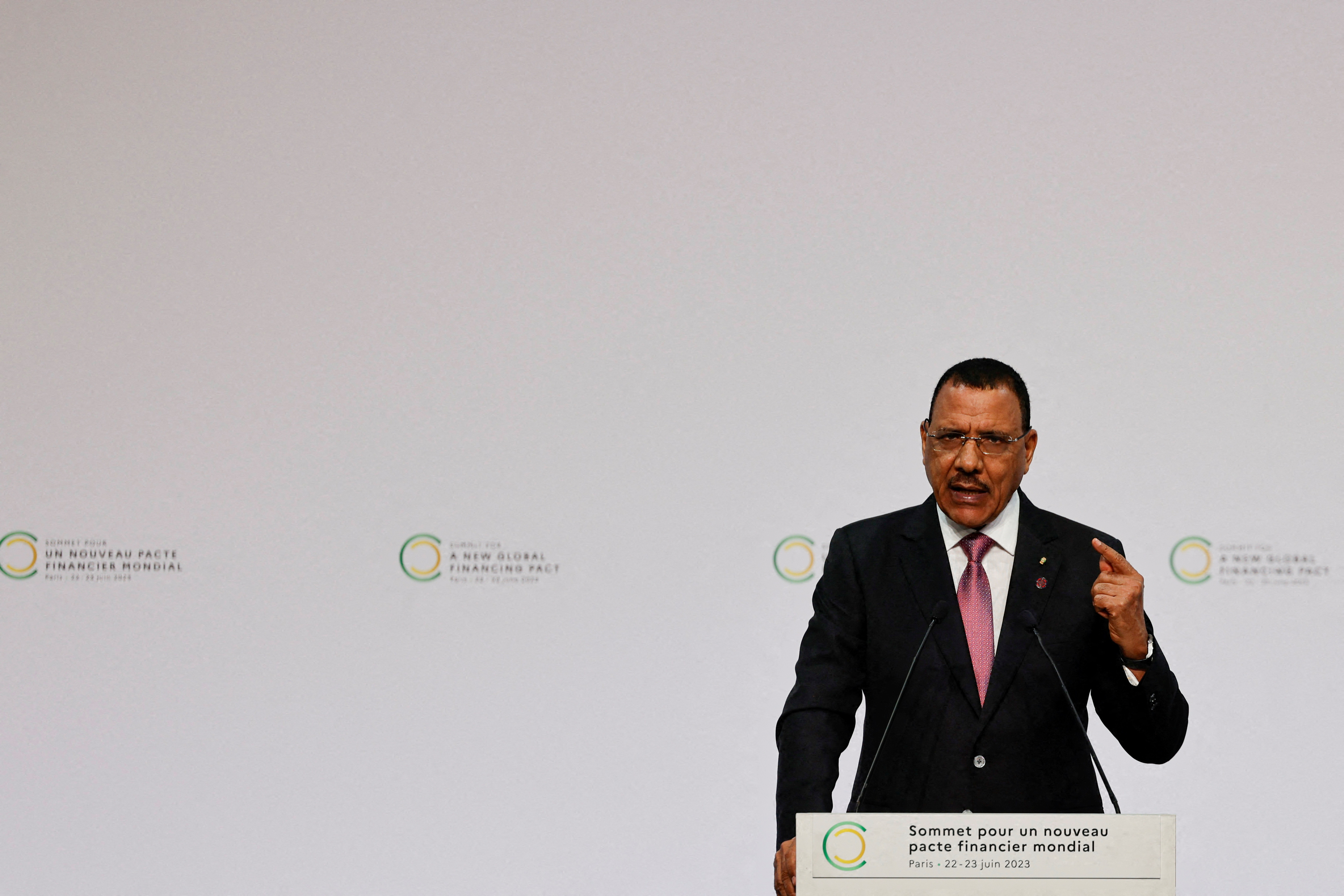 尼日尔总统穆罕默德·巴祖姆在巴黎布罗涅宫参加2023年6月22日新全球金融协定峰会开幕式上发表讲话。路德维克·马兰/法新社/彭博社/路透社/档案照片