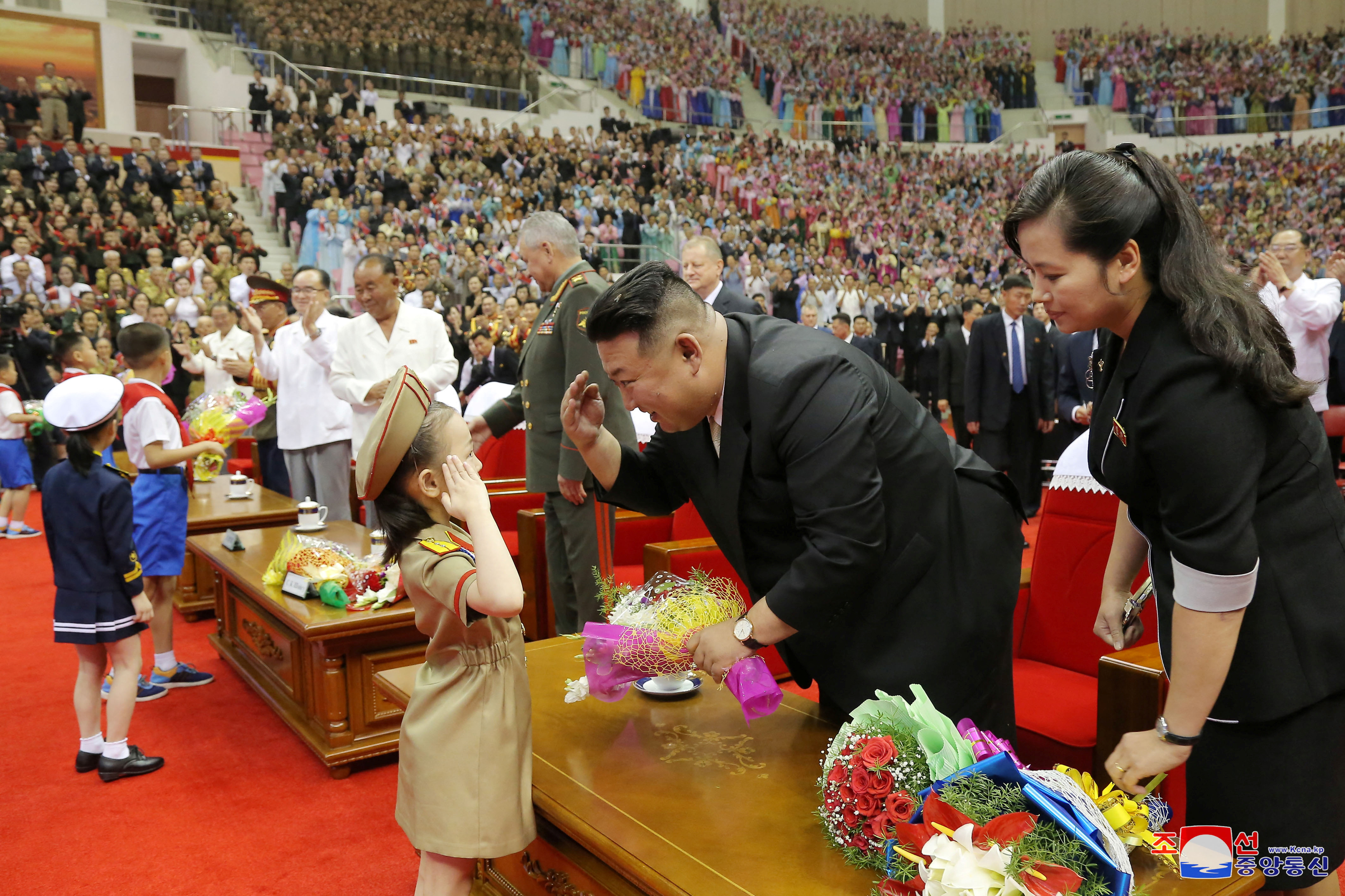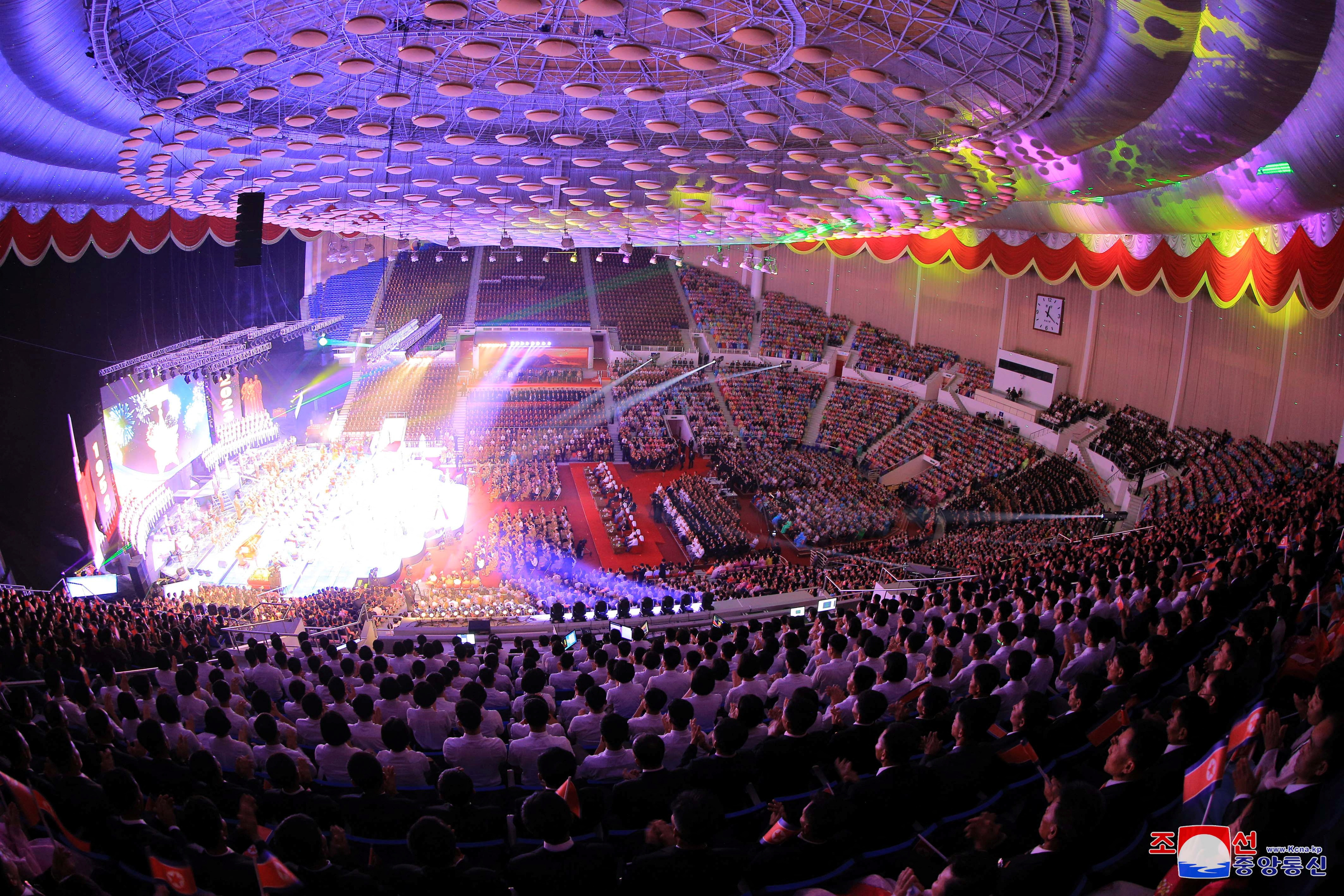 官方媒体的照片显示金正恩在一场盛大的演出上,谢尔盖·绍伊古和李站在他身旁,背景包括一条中国军队朝鲜战争口号,誓言“抵抗美国侵略者”。