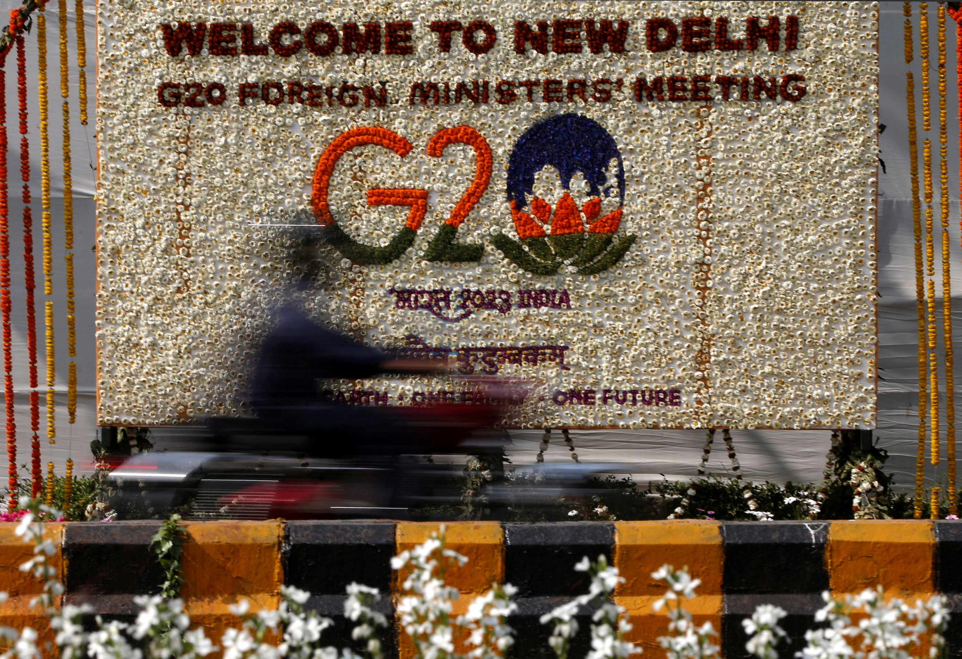 一名司机驶过一处用鲜花装饰的围栏,欢迎2023年3月1日在印度新德里举行的G20外长会议。路透社/Amit Dave/文件照片