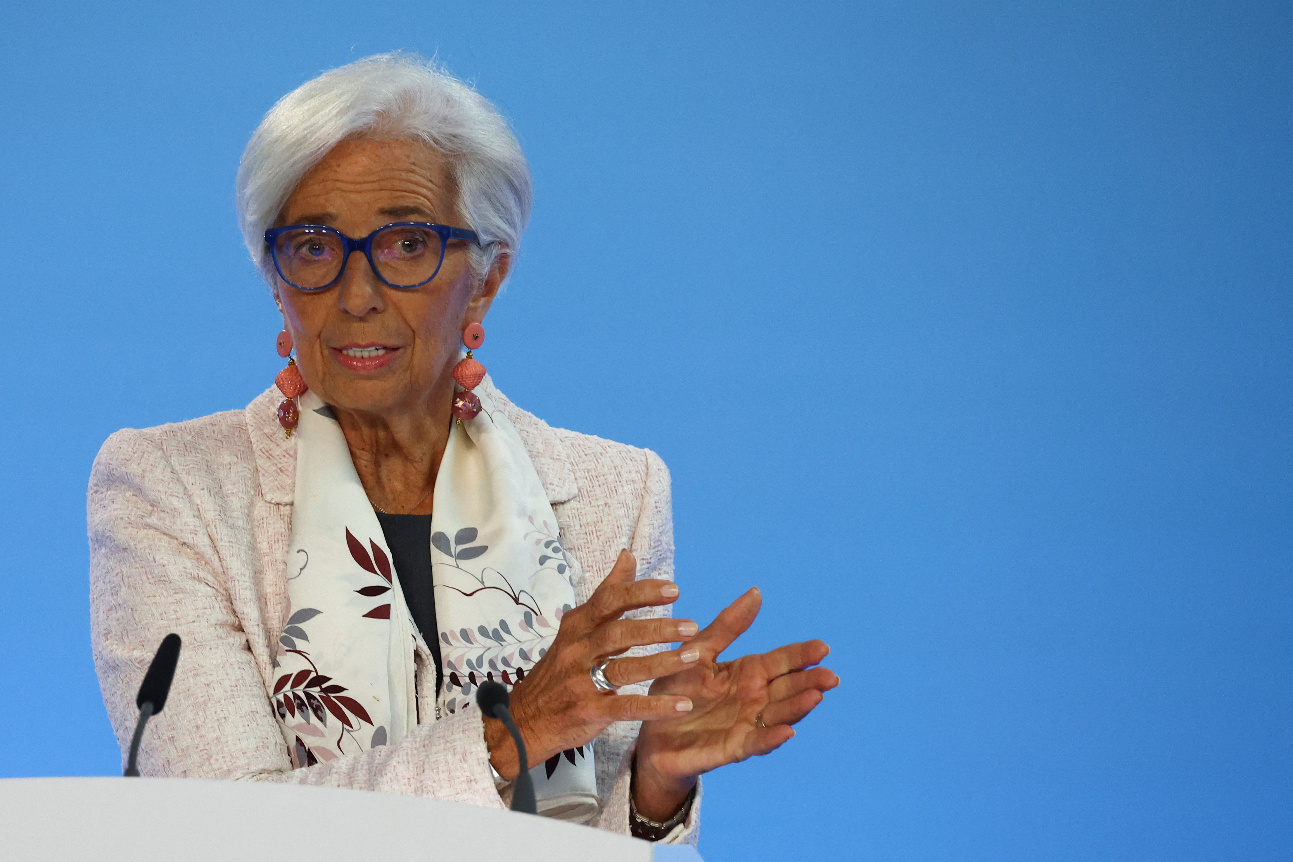 欧洲央行(ECB)行长克里斯汀·拉加德于2023年7月27日在德国法兰克福的欧洲央行总部举行的货币政策会议后向媒体发表讲话。路透社/凯·帕芬巴赫(Kai Pfaffenbach)摄