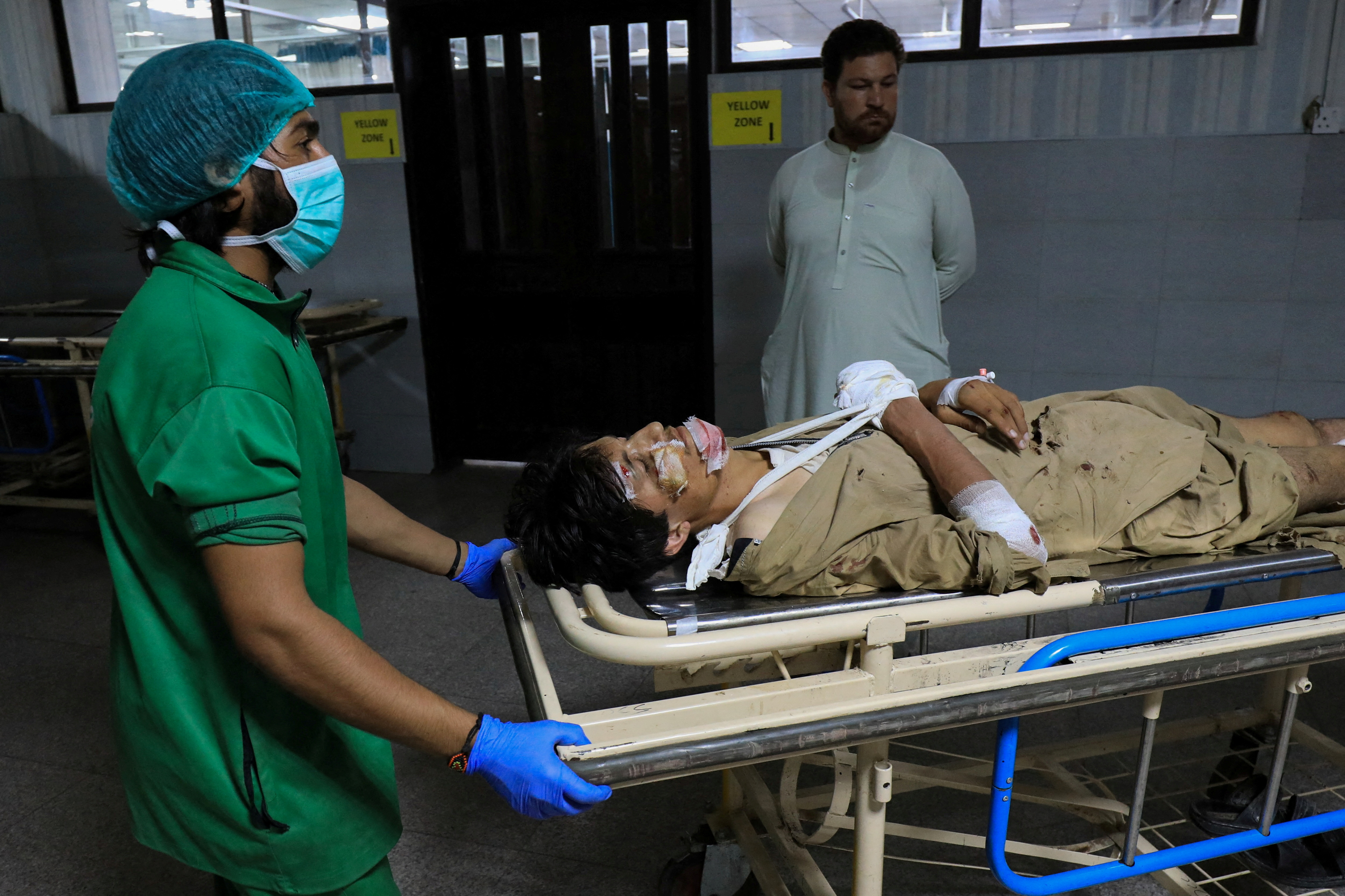 人们将一名在巴基斯坦开伯克图赫瓦省巴焦尔地区爆炸后受伤的男子运送到白沙瓦的莱丽医院,图片拍摄于2023年7月30日。路透社/Fayaz Aziz
