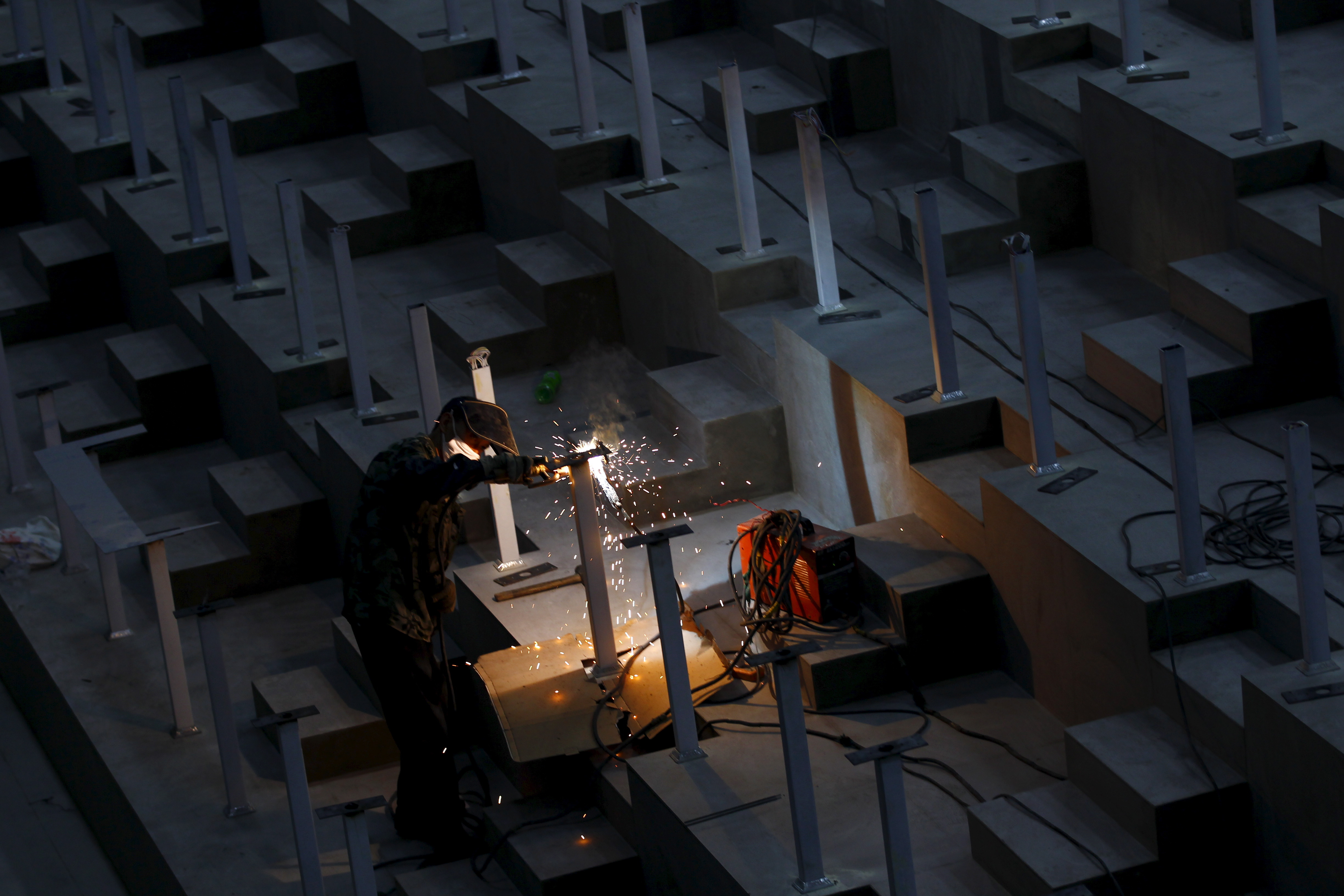 一名工人在云南省昆明市一家正在建设中的市场进行焊接作业,照片摄于2015年8月12日。REUTERS/Wong Campion/文件照片